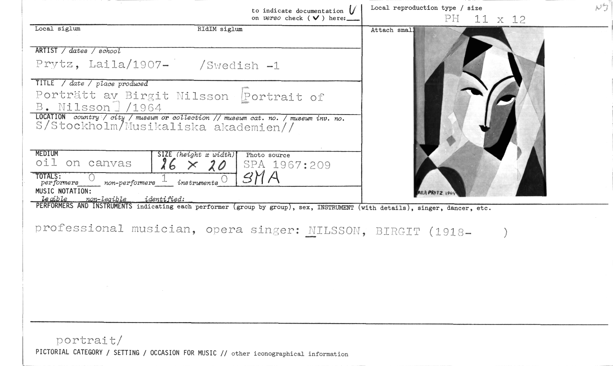 //// to indicate documentation ti on verso check ( V ) here:_ //// Local reproduction type / size //// 11 //// Local siglum //// Attach smal //// RIdIM siglum //// ARTIST / dates / school //// Prytz, Laila/1907- //// /Swedish -1 //// TITLE / date / place produced //// Porträtt av Birgit Nilsson ortrait of //// B. Nilsson? /1964 //// LOCATION country / city / museum or collection // museum cat. no. / museum inv. no. //// S/Stockholm/Musikaliska akademien// //// MEDIUM //// oil on canvas //// SIZE (hcbght x width) //// 26 x29 //// Photo source //// SPA 1967:209 //// -MALS: //// per formers non-perfbrmers 1 instruments //// gdA //// MUSIC NOTATION: tA PRrrz INS //// lecdble non-leadble identified; //// PERFORMERS AND INSTRUMENTS indicating each performer (group by group), sex, INSTRUMENT (with details), singer, dancer, etc. //// professional musician, opera singer: NILSSON BIRGIT (1918- //// nortrait/ //// PICTORIAL CATEGORY / SETTING / OCCASION FOR MUSIC // other iconographical information ////