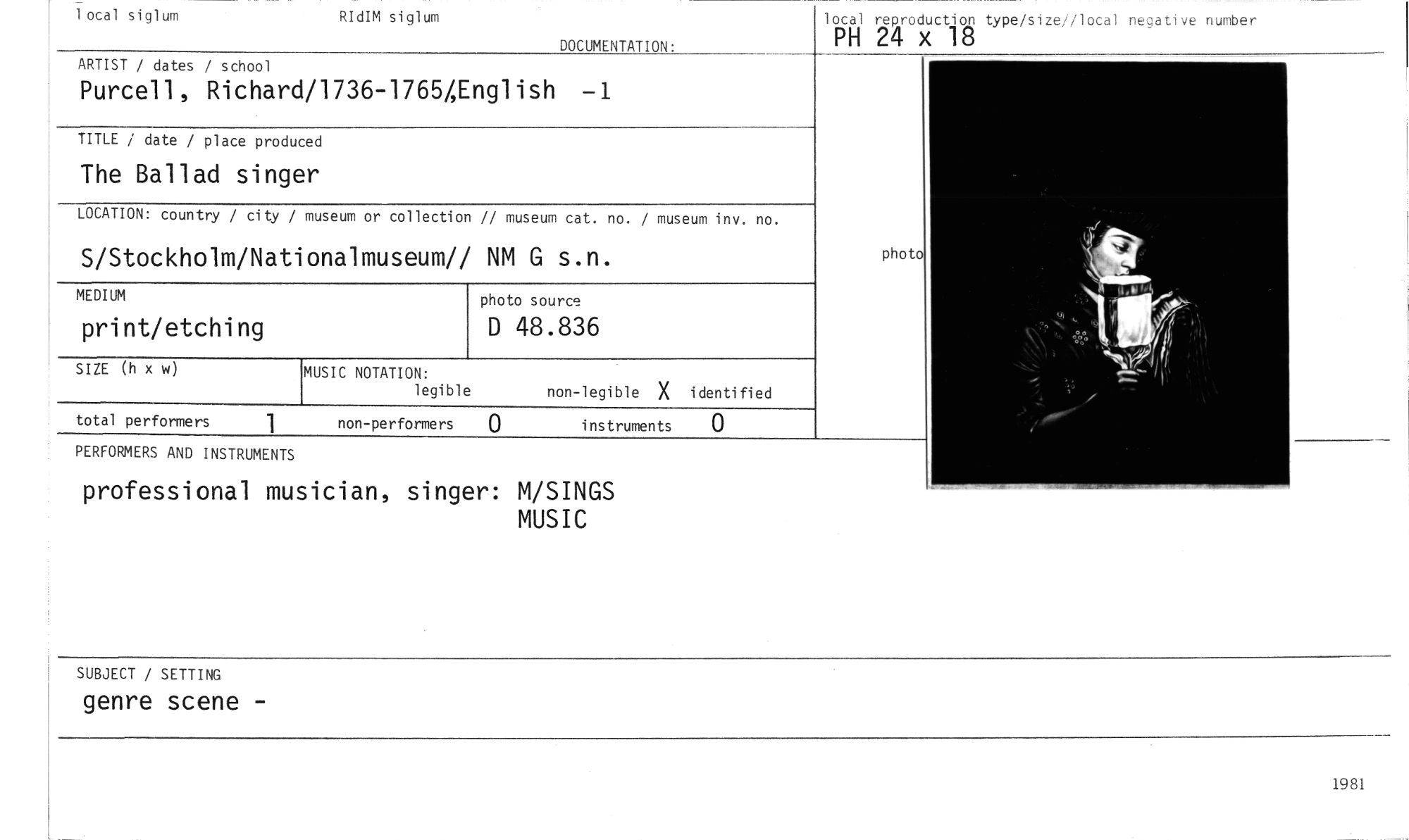 //// local siglum RIdIM siglum //// DOCUMENTATION: //// local reproduction type/size//local negative nutuber //// PH 24 x 18 //// ARTIST / dates / school //// Purcell, Richard/1736-1765/,English -1 //// TITLE / date / place produced //// The Ballad singer //// LOCATION: country / city / museum or collection // museum cat. no. / museum inv. no. //// S/Stockholm/Nationalmuseum// NM G s.n. //// MEDIUM //// print/etching //// MUSIC NOTATION: //// legible non-legible X identified //// total performers 1 non-performers Q instruments 0 //// PERFORMERS AND INSTRUMENTS //// professional musician, singer: M/SINGS //// MUSIC //// SIZE (h x w) //// photo source //// D 48.836 //// phot //// SUBJECT / SETTING //// genre scene - //// 1981 ////