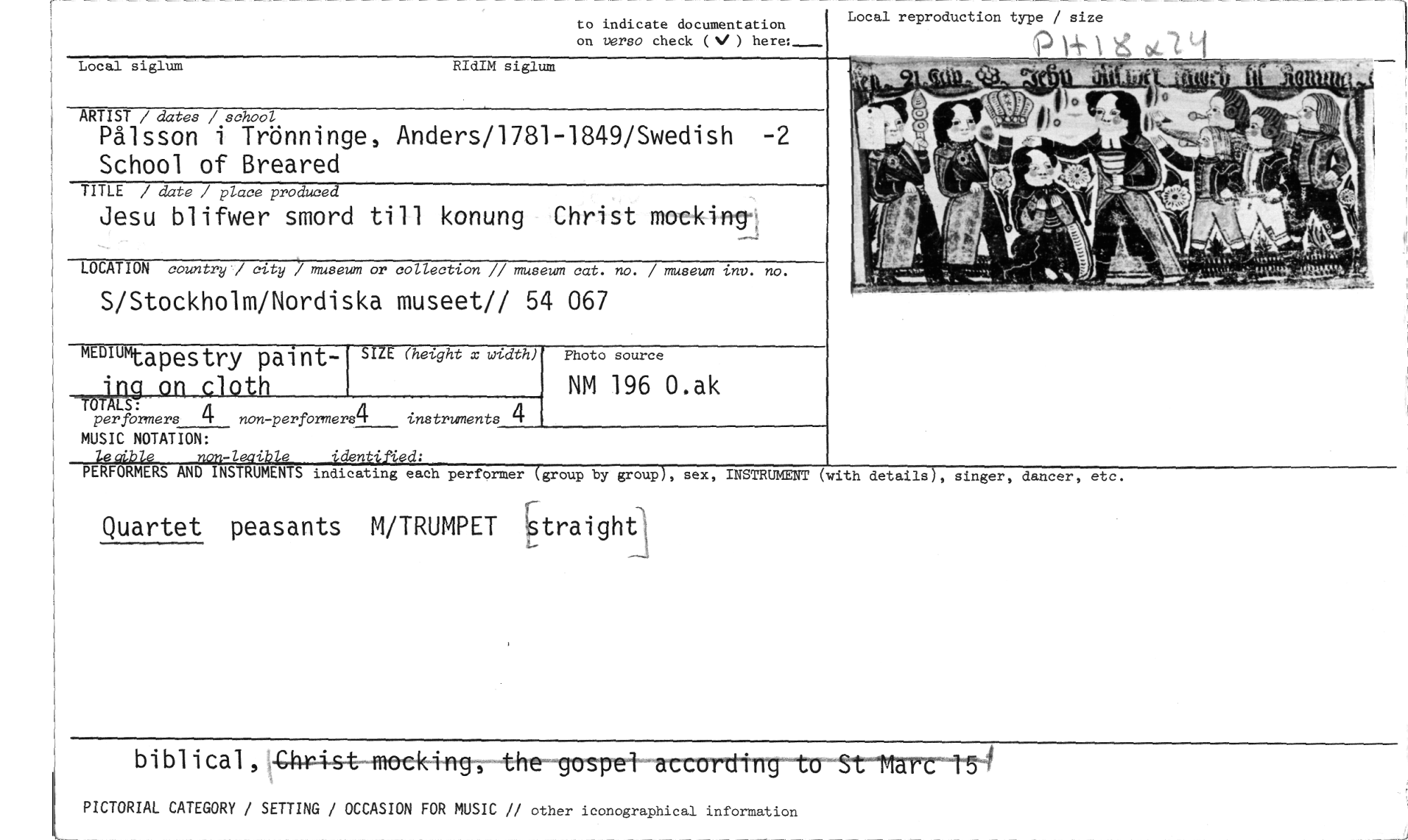 //// Local reproduction type / size //// to indicate documentation on verso check ('../ ) here: //// Local siglum RIdIM siglum //// ARTIST / datas / school //// Pålsson i Trönninge, Anders/1781-1849/Swedish -2 School of Breared //// TITLE / date / place produce //// Jesu blifwer smord till konung Christ mocking //// LOCATION country / city / museum or collection // museum cat. no. / museum inv. no. //// S/Stockholm/Nordiska museet// 54 067 //// mEmukapestry paint- //// SIZE (height x width) //// Photo source //// NM 196 0.ak //// Sg on ,cloth //// MAL //// per formers 4 non-performers4 instruments 4 //// MUSIC NOTATION: //// le a.ble non-leaible identijivd: //// PERFORMERS AND INSTRUMENTS indicating each performer (group by group), sex, INSTRUMENT //// Quartet peasants M/TRUMPET ktraight //// (with details), singer, dancer, etc. //// bi bl i cal , Okni st ifflock-ing, the- gospel ak.tur t cirC ltd //// PICTORIAL CATEGORY / SETTING / OCCASION FOR MUSIC // other iconographical information ////