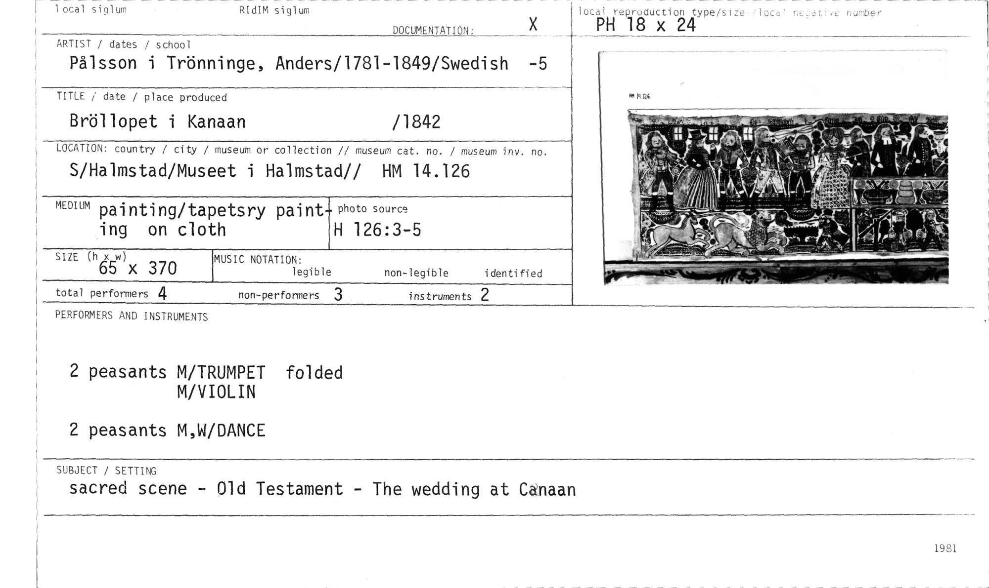 //// local siglum RIdIM siglum //// local reproduction type/size local ne...e e number //// PH 18 x 24 //// DOCUMENTATION: //// ARTIST / dates / school //// Pålsson i Trönninge, Anders/1781-1849/Swedish -5 //// TITLE / date / place produced //// Bröllopet i Kanaan /1842 //// LOCATION: country / city / museum or collection // museum cat. no. / museum inv. no. //// S/Halmstad/Museet i Halmstad// HM 14.126 //// MEDIUM painting/tapetsry paint- photo source ing on cloth H 126:3-5 //// SIZE (h65 w //// 65 ) x 370 //// MUSIC NOTATION: //// legible //// non-legible identified //// non-performers 3 instruments 2 //// total performers 4 //// PERFORMERS AND INSTRUMENTS //// 2 peasants M/TRUMPET folded M/VIOLIN //// 2 peasants M,W/DANCE //// SUBJECT / SETTING //// sacred scene - Old Testament - The wedding at Cånaan //// 1981 ////
