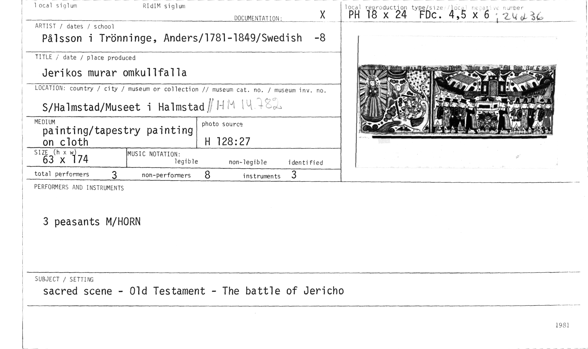 //// 1 ocal siglum //// RIdIM siglum //// DOCUMENTATION: //// 1i41 rieårodxuctri u //// typgfkiz.e, 91o:g nxe: g i,. ntitec4 //// x //// ARTIST / dates / school //// Pålsson i Trönninge, Anders/1781-1849/Swedish -8 //// TITLE date / place produced //// Jerikos murar omkullfalla //// lo O1 u fl tr //// LOCATION: country / city / museum or collection // museum cat. no. / museum inv. no. //// S/Halmstad/Museet i Halmstad il H M //// MEDIUM //// painting/tapestry painting on cloth //// photo source //// H 128:27 //// MUSIC NOTATION: //// legible non-legible identified //// instruments 3 //// total performers //// non-performers //// PERFORMERS AND INSTRUMENTS //// 3 peasants M/HORN //// SUBJECT / SETTING //// sacred scene - Old Testament - The battle of Jericho //// 1981 ////