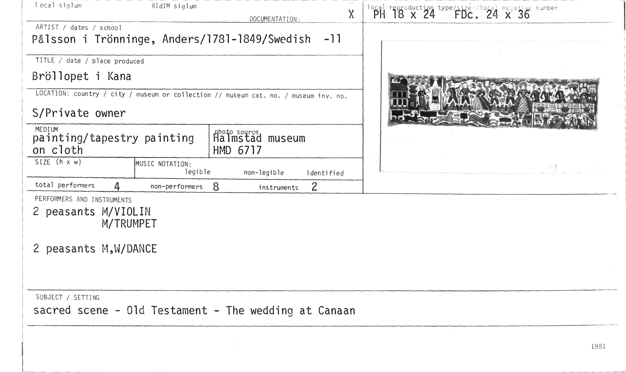 //// wodlö X uctGL uo% type411jtUC..1 Xlow negatåt nurober //// I //// DOCUMENTATION: //// lotal siglum RIdIM siglum //// ARTIST / dates / school //// Pålsson i Trönninge, Anders/1781-1849/Swedish -11 //// TITLE / date / place produced //// Bröllopet i Kana //// LOCATION: country / city / museum or collection // museum cat. no. / museum inv, no. //// S/Private owner //// ji,\ Er-3Y-Sns^ k' //// MUSIC NOTATION: //// legible //// MEDIUM //// painting/tapestry painting on cloth //// SIZE (h x w) //// kangtä museum //// HMD 6717 //// non-legible identified //// total performers 4 non-performers 8 instruments //// PERFORMERS AND INSTRUMENTS //// 2 peasants M/VIOLIN //// M/TRUMPET //// 2 peasants M,W/DANCE //// SUBJECT / SETTING //// sacred scene - Old Testament - The wedding at Canaan //// 1981 ////