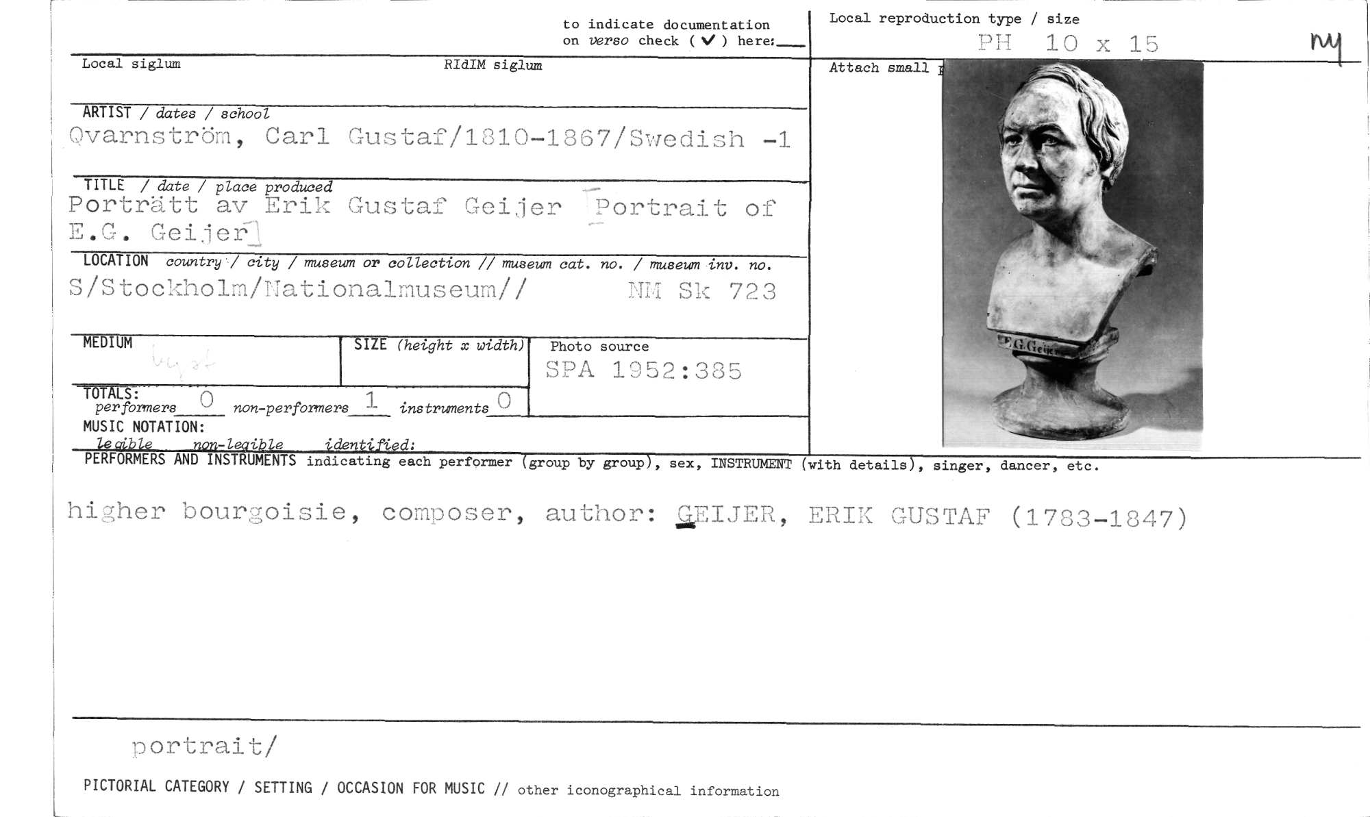 //// Attach small //// to indicate documentation //// on verao check (d) here:— //// Local reproduction type / size //// 1-)H. 10 x 15 //// RIdIM siglum //// Local siglum //// ARTIST / dates / school //// Ovarnström, Carl Gustaf/1810-1867/Swedish - //// TITLE / date / place produced //// Porträtt av Erik Gustaf Geijer Portrait of E.G. Geijer;7 //// LOCATION country / city / museum or collection // museum cat. no. / museum inv. no. //// S/Stockholm/Nationalmuseum// Ni- Sk 723 //// SIZE (height x width) //// Photo source //// STA 1952:385 //// MEDIUM //// per formers 0 instrume t //// MUSIC NOTATION: //// gible_nop-legible identified: //// PER ORMERS AND INSTRUMENTS indicating each performer (group by group), sex, INSTRUMENT (with //// "7MM— //// hio-her bourgoisie, composer, author: WIJER, ERIK GUSTAF (1783-1847) //// portrait/ //// PICTORIAL CATEGORY / SETTING / OCCASION FOR MUSIC // other iconographical information //// details), singer, daner, etc. ////