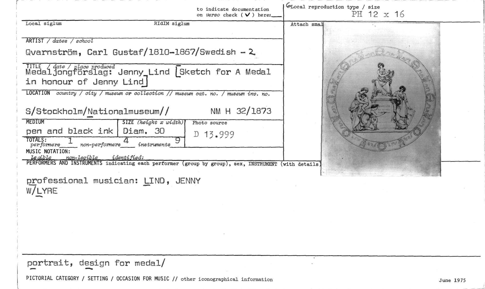 //// to indicate documentation on verso check ( ) //// 4?Local reproduction type / size //// PH 12 x 16 //// Local siglum RIdIM siglum //// Attach smal //// ARTIST / dates / school //// Qvarnström, Carl Gustaf/1810-1867/Swedish —2. //// TITLE /date/rlampl~d //// Medaljongförslag: Jenny Lind [sketch for A Medel in honour of Jenny Lind] //// LOCATION country / city / museum or collection // museum cat. no. / museum tnv. no. //// S/Stockholm/Nationalmuseum// NM H 32/1873 //// MEDIUM SIZE (height x width) //// pen and black ink Diam. 30 //// MALS: //// per formers non-performers instruments //// MUSIC NOTATION: //// le4ihle non-leaible identified; //// PERFORMERS AND INSTRUMENTS indicating each performer (group by group), sex, INSTRUMENT (with details: //// Photo source //// D 13.999 //// professional musician: LIND, JENNY W/LYRE //// portrait, design for medal/ //// PICTORIAL CATEGORY / SETTING / OCCASION FOR MUSIC // other iconographical information //// June 1975 //// ////