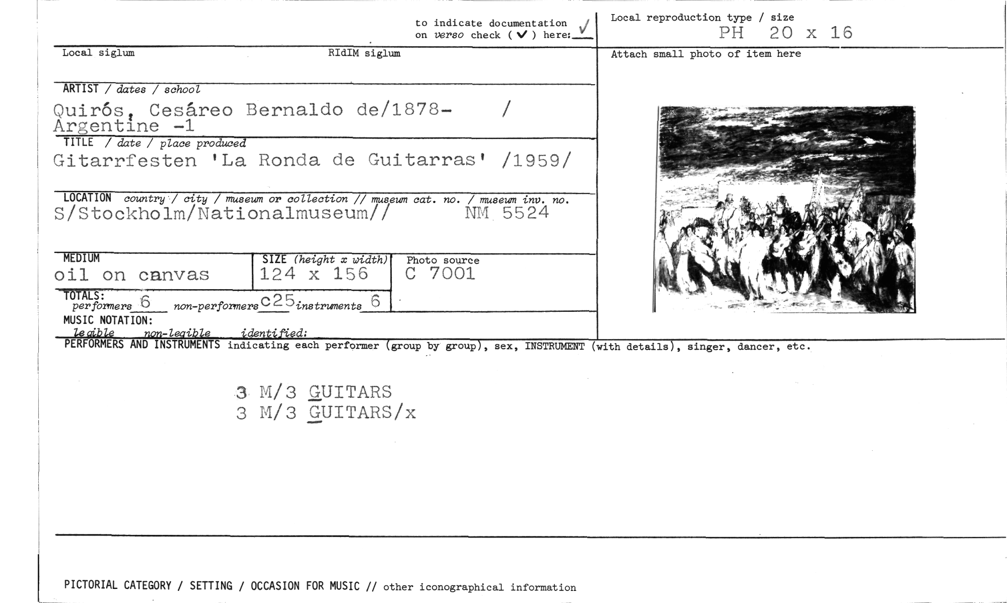 //// to indicate documentation on verso check ( ) here: 5- //// Local reproduction type / size //// PH 20 x 16 //// Attach small photo of item here //// ARTIST / dates / school //// Quir6si Cesåreo Bernaldo de/1878- Argentine -1 //// TITLE / date / place produced //// Gitarrfesten 'La Ronda de Guitarras' /1959/ //// LOCATION country / city / museum or collection // museum cat. no. / museum tnv. no. //// S/Stockholm/Nationalmuseum// NM 5524 //// Photo source //// C 7001 //// MEDIUM //// oil on canvas //// TOTALS: //// per formers 0 non-performers025instruments //// SIZE (height x width) //// 124 x 156 //// Local siglum RIdIM siglum //// MUSIC NOTATION: //// lealble non-leoible identified; //// PERFORMERS AND INSTRUMENTS indicating each performer (group by group), sex, INSTRUMENT (with detailsY, singer, dancer, etc. //// 3 M/3 GUITARS //// 3 M/3 GUITARS/x //// PICTORIAL CATEGORY / SETTING / OCCASION FOR MUSIC // other iconographical information ////