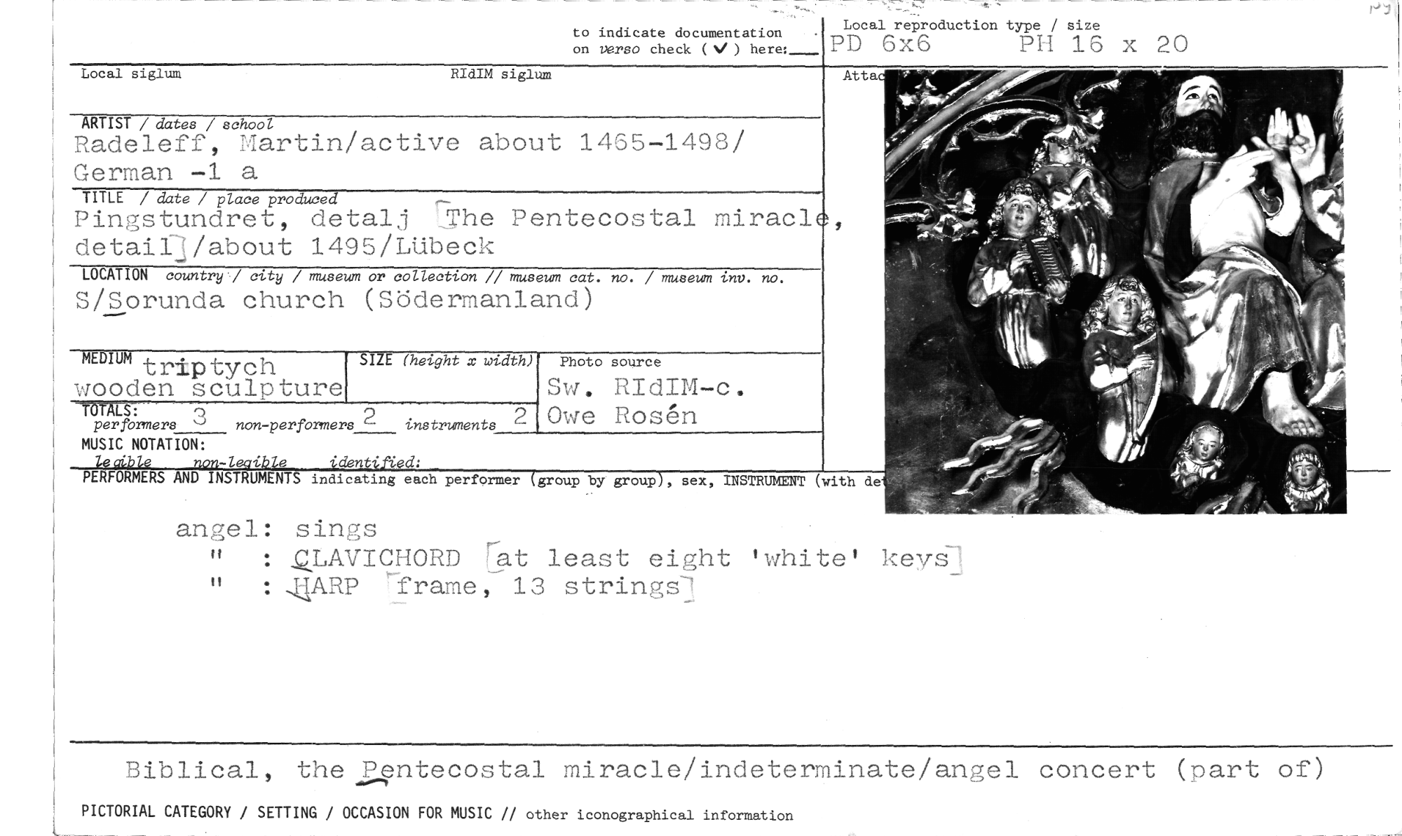 //// angel: sings //// " : ZLAVICHORD rat least eight 'white' kevåi " :41ARP --frame, 13 strings-1 //// Åtta //// 1 //// e //// d: //// PE //// F //// ERS AND INSTRUMENTS indicating each performer group by group , sex, INSTRUMENT (with de //// to indicate documentation //// Local reproduction type / size //// • //// on verso check (V) here: PD 6x6 //// PII 16 x 20 //// ARTIST / datea / school //// Radeleff, Martin/active about 1465-1498/ German -1 a //// TITLE / date / place produced //// Pingstundret, detalj 7-The Pentecostal miracl detair2/about 1495/LUbeck //// LOCATION country '/ city / museum or collection // museum cat. no. / museum inv. no. //// S/Sorunda church (Södermanland) //// MEDIUM1:1^±1) ty c ti SIZE (height x width) Photo source //// wooden sculpture Sw. RIdIM -c. //// per forners 3 non-perfonners 2 MUSIC NOTATION: //// instruments 2 Owe Rosen //// Local siglum //// RIdIM siglum //// Biblical, the Pentecostal miracle/indeterminate/angel concert (part of) //// PICTORIAL CATEGORY / SETTING / OCCASION FOR MUSIC // other iconographical information ////