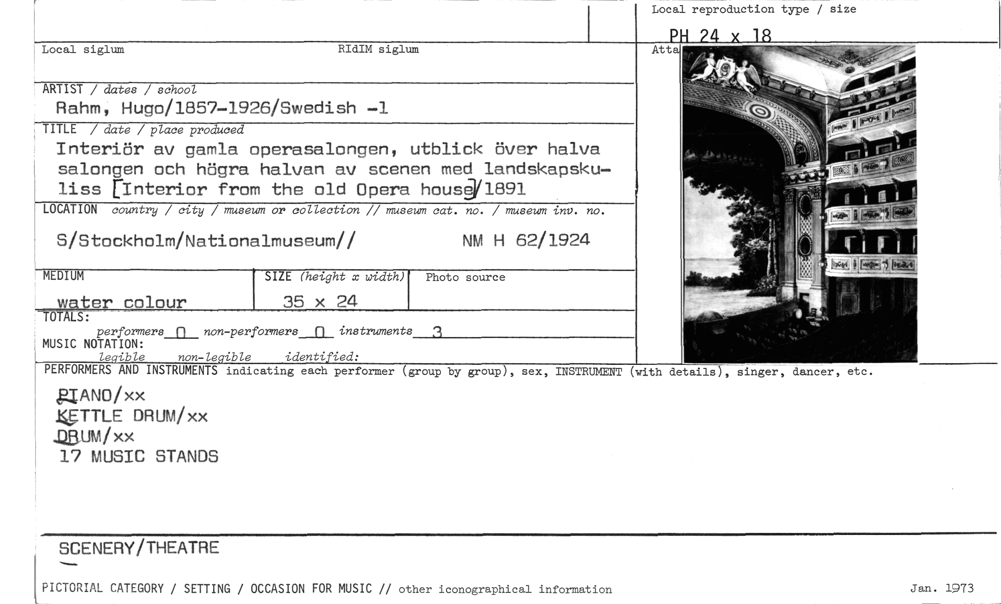 //// Local siglum RIdIM siglum //// ARTIST / dates / school //// Rahm, Hugo/1857-1926/Swedish —1 //// TITLE / date / place produced //// Interiör av gamla operasalongen, utblick över halva salongen och högra halvan av scenen med landskapskuliss rInterior from the old Opera housgV1891 //// LOCATION country / city / museum or collection // museum cat. no. / museum inv. no. //// S/Stockholm/Nationalmuseum// NM H 62/1924 //// MEDIUM SIZE (hetght x width) Photo source //// water colour 35 x 24 //// TOTALS: //// performers_n__ non-perPrmers_a_ instruments //// MUSIC NOTATION: //// legible non-legible identified: //// PERFORMERS AND INSTRUMENTS indicating each performer (group by group), sex, //// g[ANO/xx JETTLE CAIN/ XX //// .23111 i XX //// 17 MUSIC STANDS //// INSTRUMENT (with details), singer, //// PH 24 x 12 //// Atta //// Local reproduction type size //// SCENERY/THEATRE //// PICTORIAL CATEGORY / SETTING / OCCASION FOR MUSIC // other iconographical information //// Jan. 1973 ////