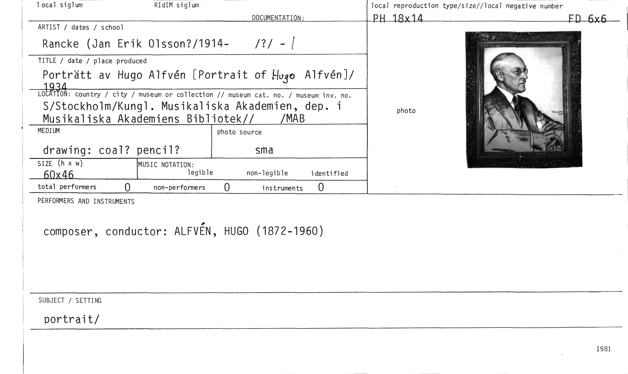 //// 1 ocal siglum RIdIM siglum //// DOCUMENTATION: //// ARTIST / dates / school //// Rancke (Jan Erik Olsson?/1914- /?/ - //// TITLE / date / place produced //// Porträtt av Hugo Alfvn Portrait of 90so Alfvki/ //// LO1C21AIN: country / city / museum or collection // museum cat. no. / museum inv. no. //// S/Stockholm/Kungl. Musikaliska Akademien, dep. i Musikaliska Akademiens Bibliotek// /MAB //// MEDIUM photo source //// drawing: coal? pencil? sma //// SIZE (h x w) MUSIC NOTATION: //// 60x46 legible non--legible i denti fi ed //// //// //// photo //// local reproduction type/size//local negative number //// PH 18x14 FD 6x6 //// total performers 0 non-performers 0 instruments 0 //// PERFORMERS AND INSTRUMENTS //// composer, conductor: ALFVEN, HUGO (1872-1960) //// SUBJECT / SETTING //// portrait/ //// 1991 ////