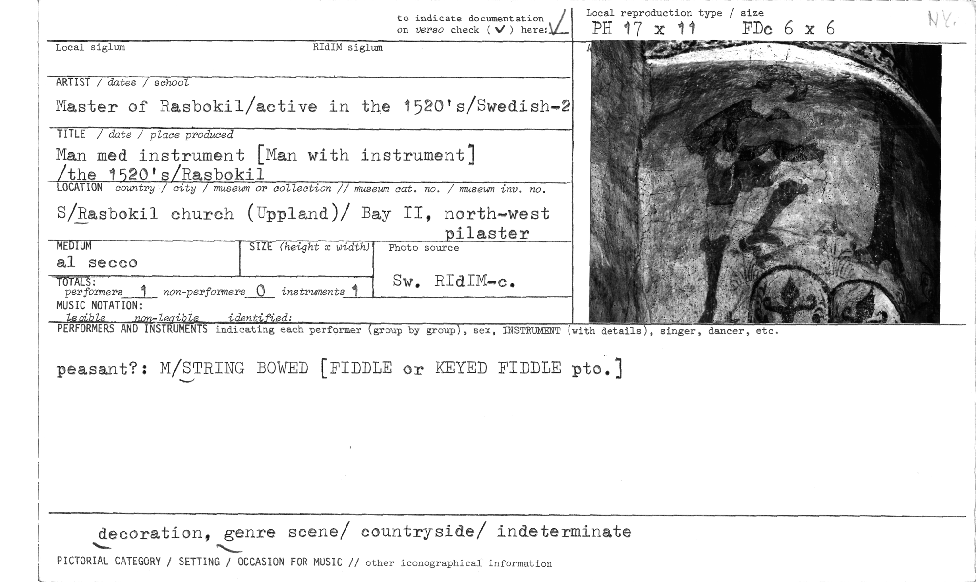 //// to indicate documentation v/I Local reproduction type / size //// on Versa check (V) here: PH 17 De 11 PDC 6 x //// 'dent //// PE FORMERS AND INSTRUMENTS indicating each performer group by group , sex, INSTRUMENT (with details), singer, dancer, etc. //// peasant?: M/STRING BOWED [FIDDLE or KEYED FIDDLE pto.] //// Local siglum RIdIM siglum //// ARTIST / dates / school //// Master of Rasbokil/active in the 1520's/Swedish-2 //// TITLE / date / place produced //// Man med instrument [Man with instrument] //// Kthe 1520's/Rasbokil 3CATION country / city / museum or collection // museum cat. no. / museum inv. no. S/Rasbokil church (Uppland)/ Bay II, north-west //// pilaster //// Photo source //// MEDIUM //// al secco //// SIZE (height x width) //// TÖTALS: //// performers_j__ non-performers_Q_ instruments_j___ //// MUSIC NOTATION: //// Sw. RIdIM-c. //// decoration„ genre scene/ countryside/ indeterminate //// PICTORIAL CATEGORY / SETTING / OCCASION FOR MUSIC // other iconographicaI information ////