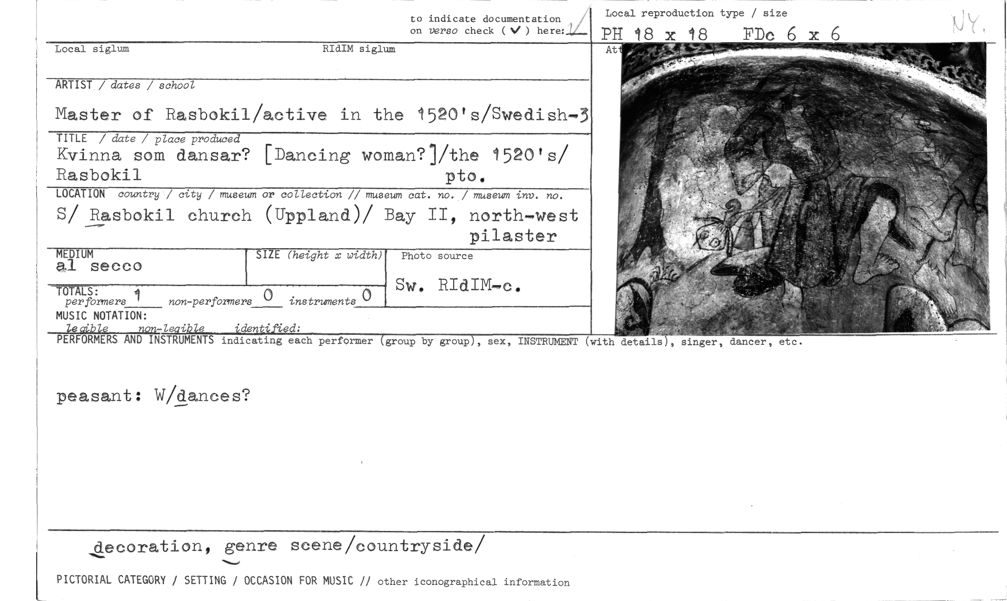 //// to indicate documentation //// on versa check (4./ ) here: //// Local reproduction type / size //// PH 18 x 18 lik 6 x //// Local siglum RIdIM siglum //// At //// ARTIST / dates / school //// Master of Rasbokil active in the 1520's/Swedish-3 //// TITLE / date / place produced //// Kvinna som dansar? [Dancing womanl/the 1520's/ Rasbokil pto. //// LOCATION country / city / museum or collection // museum cat. no. / museum inv. no. //// S/ Rasbokil church (Uppland)/ Bay II, north-west //// pilaster //// MEDIUM //// 41 secco //// Photo source //// SIZE (height x width) //// Sw. RIdIM-c. //// per formers 4 non-perfbrmers 0 instruments //// MUSIC NOTATION: //// non-leaible identified: //// PERFORMERS AND INSTRUMENTS indicating each performer (group by group), sex, //// INSTRUMENT (with details singer, dancer, etc. //// peasant: W/dances? //// decoration, genre scene/countryside/ //// PICTORIAL CATEGORY / SETTING / OCCASION FOR MUSIC // other iconographical information ////