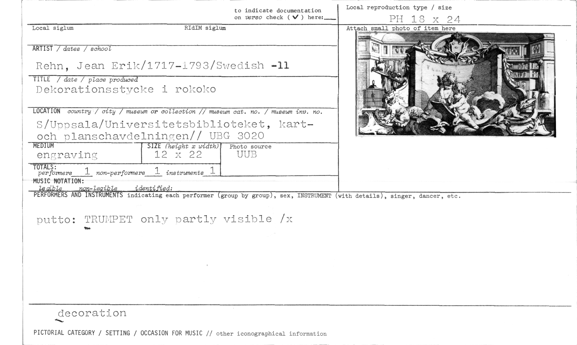 //// RIdIM //// to indicate documentation on versa check ( ) here: //// At //// Local reproduction type / size //// PH 18 x 24 //// of item here //// Local siglum //// h small photo //// siglum //// ARTIST / dates / school //// Rehn, Jean Erik/1717-1793/Swedish -11 //// TITLE / date / place produced //// Dekorationsstycke i rokoko //// LOCATION country./ city / museum or collection // museum cat. no. / museum inv. no. //// S/Unnsala/Universitetsbiblioteket, kart-och planschavdelningen// UBG 3020 //// MEDIUM SIZE (height x width) Photo source //// engraying 12 x 22 UUB //// 1 //// TETALS: //// per formers 1 non-performers 1 instruments //// MUSIC NOTATION: //// non-leaible identified: //// PERFORMERS AND INSTRUMENTS indicating each performer (group by group), sex, INSTRUMENT (with details), singer, dancer, etc. //// putto: TRUMPET only nartly visible /x //// decoration //// PICTORIAL CATEGORY / SETTING / OCCASION FOR MUSIC // other iconographical information ////