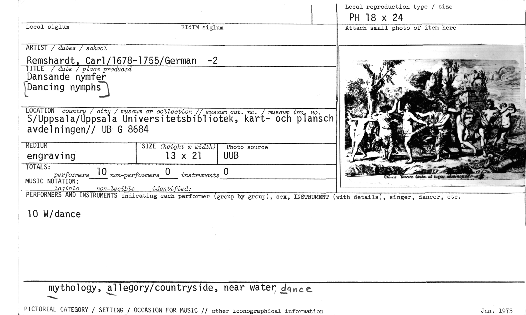 //// 10 W/dance //// mythology, allegory/countryside, near water clqhce //// PICTORIAL CATEGORY / SETTING / OCCASION FOR MUSIC // other iconographical information Jan. 1973 //// Local reproduction type / size //// PH 18 x 24 //// Local siglum RIdIM siglum //// ARTIST / dates / school //// Remshardt, Carl/1678-1755/German -2 //// TITLE / date / place produced //// Dansande nymfer //// {Dancing nymphS3 //// LOCATION country / cit / museum or collection // museum cat. no. / museum inc no. //// S/Uppsala/Uppsala Universitetsbibliotek, kart- och plansch avdelningen// UB G 8684 //// Attach small photo of item here //// MEDIUM engraving //// SIZE (helght x width) //// 13 x 21 //// Photo source //// UUB //// TOT LS: //// performersnon -performers ° instruments ° //// 10 //// MUSIC NOTATION: //// le ible non-le ible identi ied: //// PERFORMERS AND INSTRUMENTS indicating each performer (group by group), sex, INSTRUMENT (with details), singer, dancer, et ////