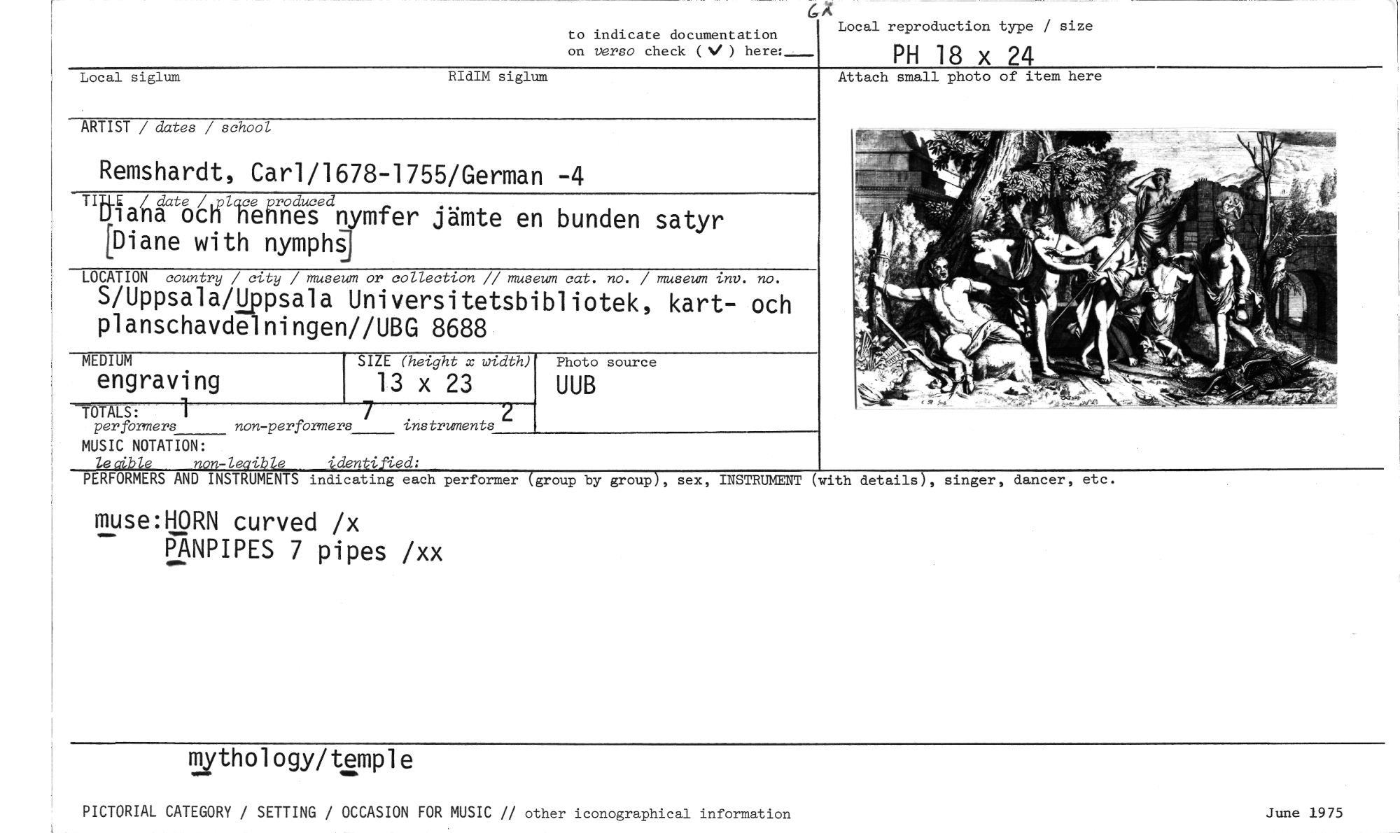 //// to indicate documentation on verso check (N/ ) here: //// Local reproduction type / size //// PH 18 x 24 //// Attach small photo of item here //// RIdIM siglum //// Local siglum //// ARTIST / dates / school //// Remshardt, Carl/1678-1755/German -4 //// 'biaikteC.P o n Seehnernymfer jämte en bunden satyr [Diane with nymphsj //// LOCATION country / city / museum or collection // museum cat. no. / museum inv. no. //// S/Uppsala/Ippsala Universitetsbibliotek, kart- och planschavdelningen//UBG 8688 //// MEDIUM //// engraving //// non-per formers //// MS: 1 //// per formers //// SIZE (height x width) //// 13 x 23 //// instruments 2-- //// Photo source //// UUB //// MUSIC NOTATION: //// leoible non-leaible identified; //// PERFORMERS AND INSTRUMENTS indicating each performer (group by group), sex, INSTRUMENT (with //// muse:HORN curved /x PANPIPES 7 pipes /xx //// details), singer, dancer, etc. //// mythology/temple //// PICTORIAL CATEGORY / SETTING / OCCASION FOR MUSIC // other iconographical information //// June 1975 ////