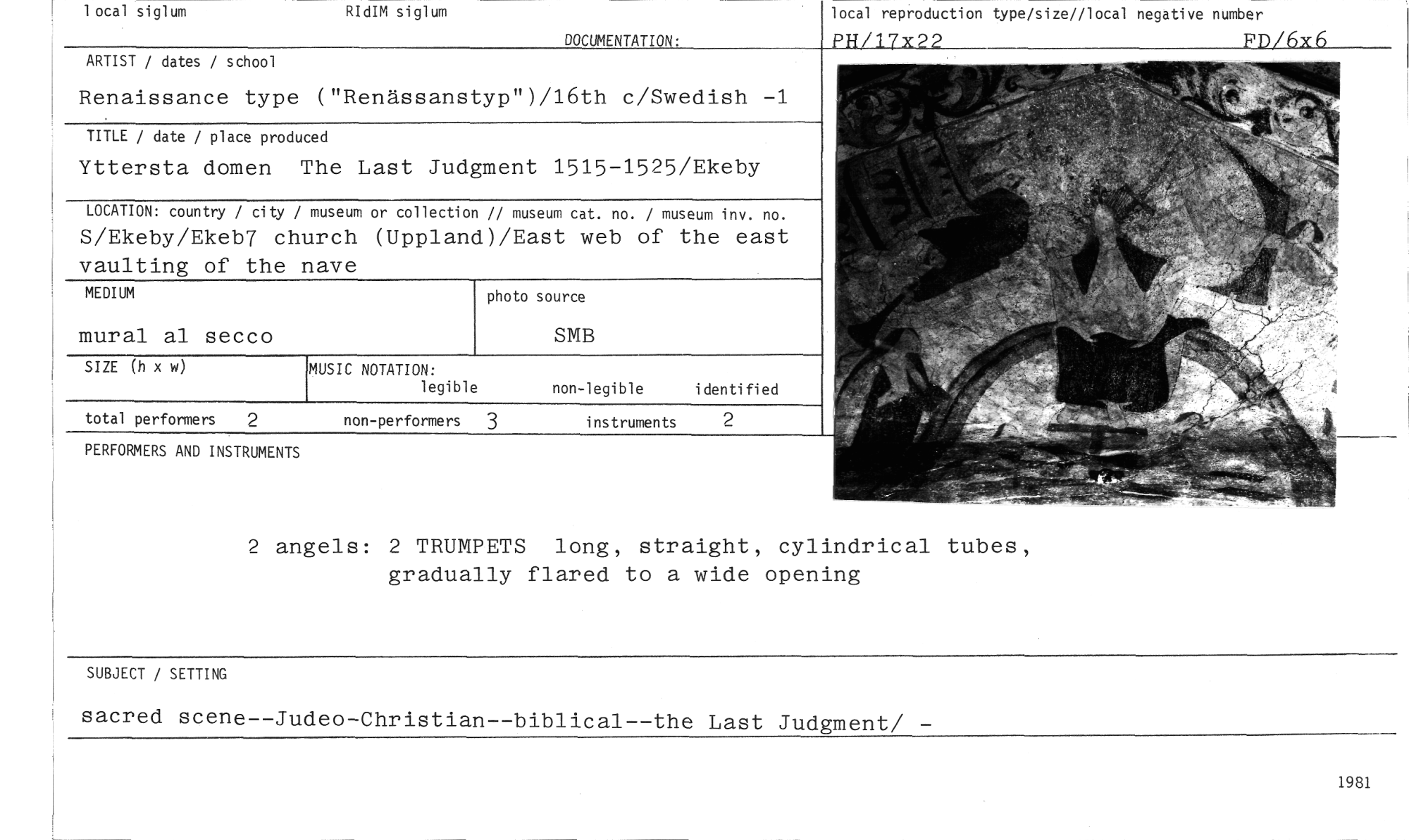 //// 1 ocal siglum //// RIdIM siglum //// DOCUMENTATION: //// local reproduction type/size//local negative number //// PH/17X22 FD/6x6 //// ARTIST / dates / school //// Renaissance type ("Renässanstyp")/16th c/Swedish -1 //// TITLE / date / place produced //// Yttersta domen The Last Judgment 1515-1525/Ekeby //// LOCATION: country / city / museum or collection // museum cat. no. / museum inv. no. //// S/Ekeby/Ekeb7 church (Uppland)/East web of the east vaulting of the nave //// MEDIUM //// SMB //// SIZE (h x w) //// non-legible identified //// total performers 2 non-performers 3 instruments 2 //// PERFORMERS AND INSTRUMENTS //// mural al secco //// MUSIC NOTATION: //// legible //// photo source //// 2 angels: 2 TRUMPETS long, straight, cylindrical tubes, gradually flared to a wide opening //// SUBJECT / SETTING //// sacred scene--Judeo-Christian--biblical--the Last Judgment/ - //// 1981 ////