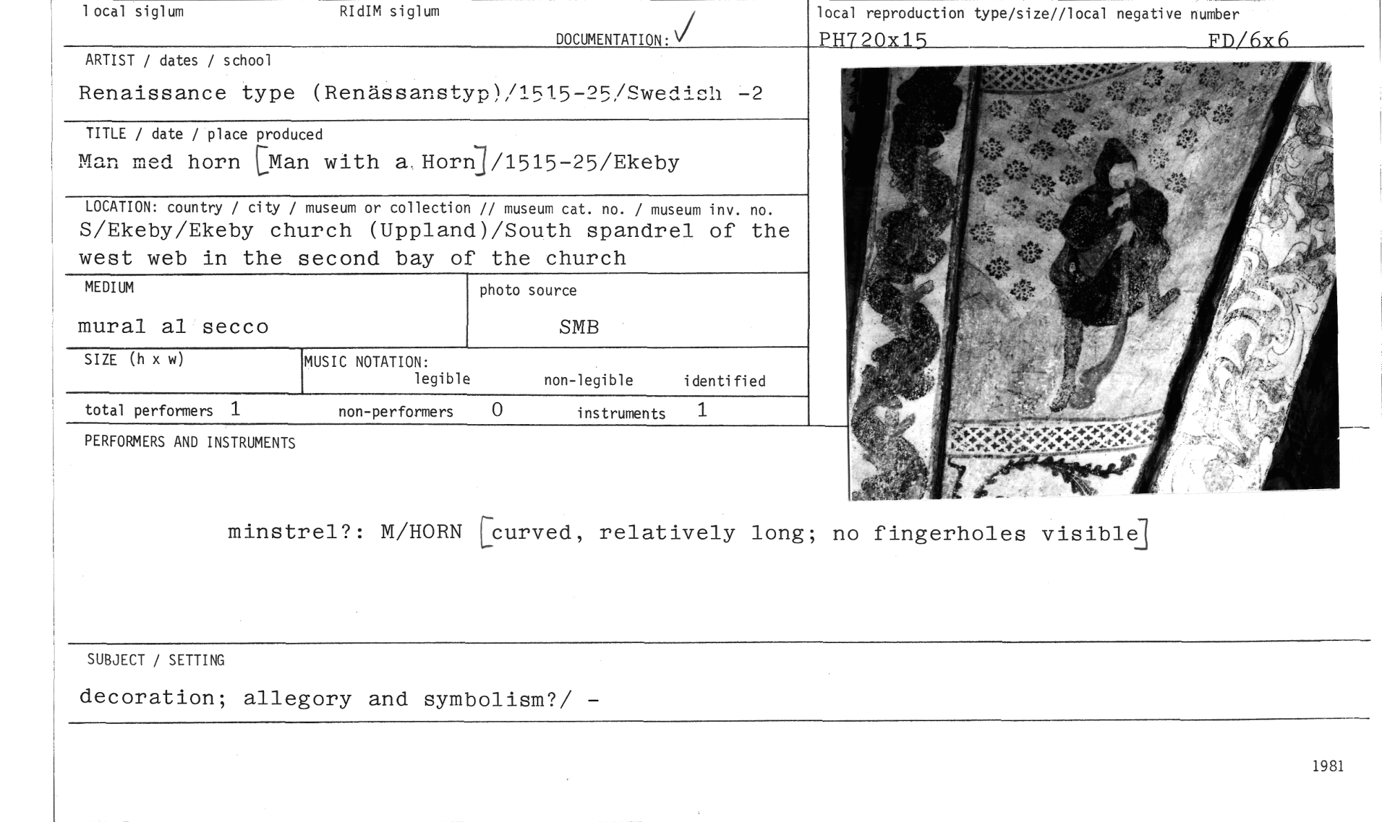 //// PERFORMERS AND INSTRUMENTS //// local reproduction type/size//local negative number PH720x15 FD/6x6 //// 1 ocal siglum RIdIM siglum //// DOCUMENTATION. //// ARTIST / dates / school //// Renaissance type (Renässanstyp)/1515-25/Swedish -2 //// TITLE / date / place produced //// Man med horn [Man with a.Horn3/1515-25/Ekeby //// LOCATION: country / city / museum or collection // museum cat. no. / moeuminv. no. //// S/Ekeby/Ekeby church (Uppland)/South spandrel of the west web in the second bay of the church //// MEDIUM //// mural al secco //// photo source //// SMB //// SIZE (h x w) //// MUSIC NOTATION: //// legible //// non-legible identified //// total performers 1 non-performers 0 instruments 1 //// minstrel?: M/HORN [curved, relatively long; no fingerholes visible] //// SUBJECT / SETTING //// decoration; allegory and symbolism?/ - //// 1981 ////