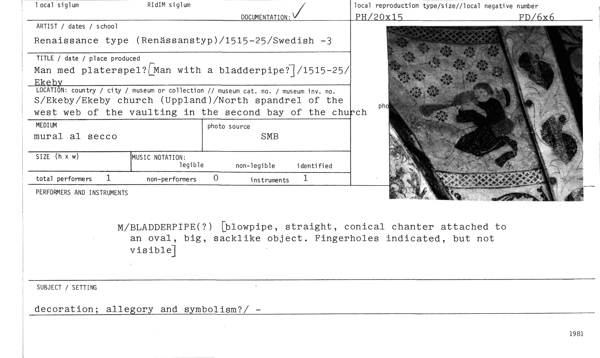 //// local reproductiofi type/size//local negative numöer //// PH/20x15 FD/6x6 //// local siglum RIdIM siglum //// DOCUMENTATION. //// ARTIST / dates / school //// Renaissance type (Renässanstyp)/1515-25/Swedish -3 //// TITLE / date / place produced //// Man med platerspel?CMan with a bladderpipe1/1515-25/ Ekebv //// LOCATION: country / city / museum or collection // museum cat. no. / museum inv. no. //// S/Ekeby/Ekeby church (Uppland)/North spandrel of the west web of the vaulting in the second bay of the chu //// ph //// rch //// MEDIUM photo source //// mural al secco SMB //// SIZE (h x w) //// total performers 1 //// PERFORMERS AND INSTRUMENTS //// MUSIC NOTATION: //// legible //// non-legible identified //// non-performers 0 instruments 1 //// M/BLADDERPIPE(?) [blowpipe, straight, conical chanter attached to an oval, big, sacklike object. Fingerholes indicated, but not visible] //// SUBJECT / SETTING //// decoration; allegory and symbolism?/ - //// 1981 ////