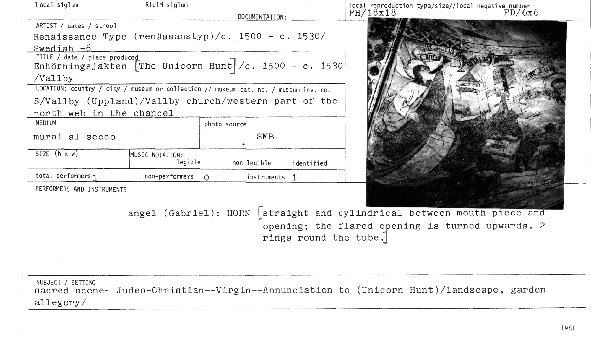 //// SUBJECT / SETTING //// sacred scene--Judeo-Christian--Virgin--Annunciation to (Unicorn Hunt)/landscape, garden allegory/ //// 1 ocal siglum RIdIM siglum DOCUMENTATION: //// MEDIUM //// mural al secco //// photo source //// local reproduction type/size//local negative number //// PH/18x18 FD/6x6 //// ARTIST / dates / school //// Renaissance Type (renässanstyp)/c. 1500 - c. 1530/ Swedish -6 //// rym / date / place produce 91 //// Enhörningsjakten (The Unicorn Hung/c. 1500 - c. 1530 /Vallby //// LOCATION: country / city / museum or collection // museum cat. no. / museum inv. no. //// S/Vallby (Uppland)/Vallby church/western part of the north web dn the chancel //// SMB //// MUSIC NOTATION: //// legible //// non-legible identified //// total performers 1 PERFORMERS AND INSTRUMENTS //// non-performers 0 instruments 1 //// angel (Gabriel): HORN [straight and cylindrical between mouth-piece an opening; the flared opening is turned upwards. 2 rings round the tubej //// 1981 ////