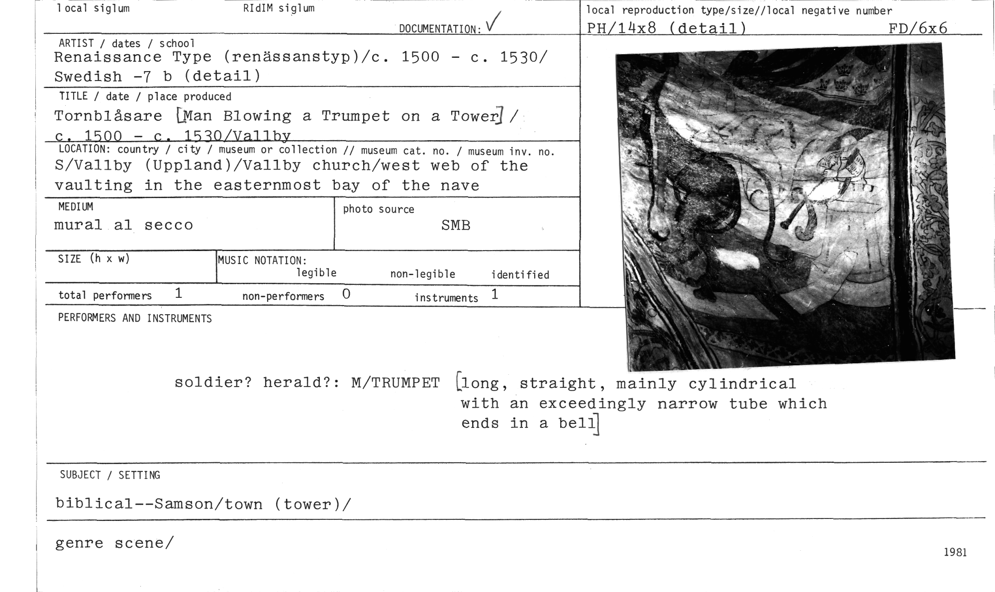 //// 1 ocal siglum //// RIdIM siglum //// DOCUMENTATION: i //// local reproduction tYPe/size//local negative number //// PH/14x8 (detail) FD/6x6 //// ARTIST / dates / school //// Renaissance Type (renässanstyp)/c. 1500 - c. 1530/ Swedish -7 b (detail) //// TITLE / date / place produced //// Tornblåsare [Man Blowing a Trumpet on a Towe/g/ //// II //// LOCATION: country / city / museum or collection // museum cat. no. / museum inv. no. //// S/Vallby (Uppland)/Vallby church/west web of the vaulting in the easternmost bay of the nave //// MEDIUM //// photo source //// mural al secco //// SMB //// total performers 1 non-performers 0 //// instruments 1 //// PERFORMERS AND INSTRUMENTS //// soldier? herald?: M/TRUMPET //// [long, straight, mainly cylindrical with an exceedingly narrow tube which ends in a Bell] //// SUBJECT / SETTING //// biblical--Samson/town (tower)/ //// genre scene/ //// 1981 ////