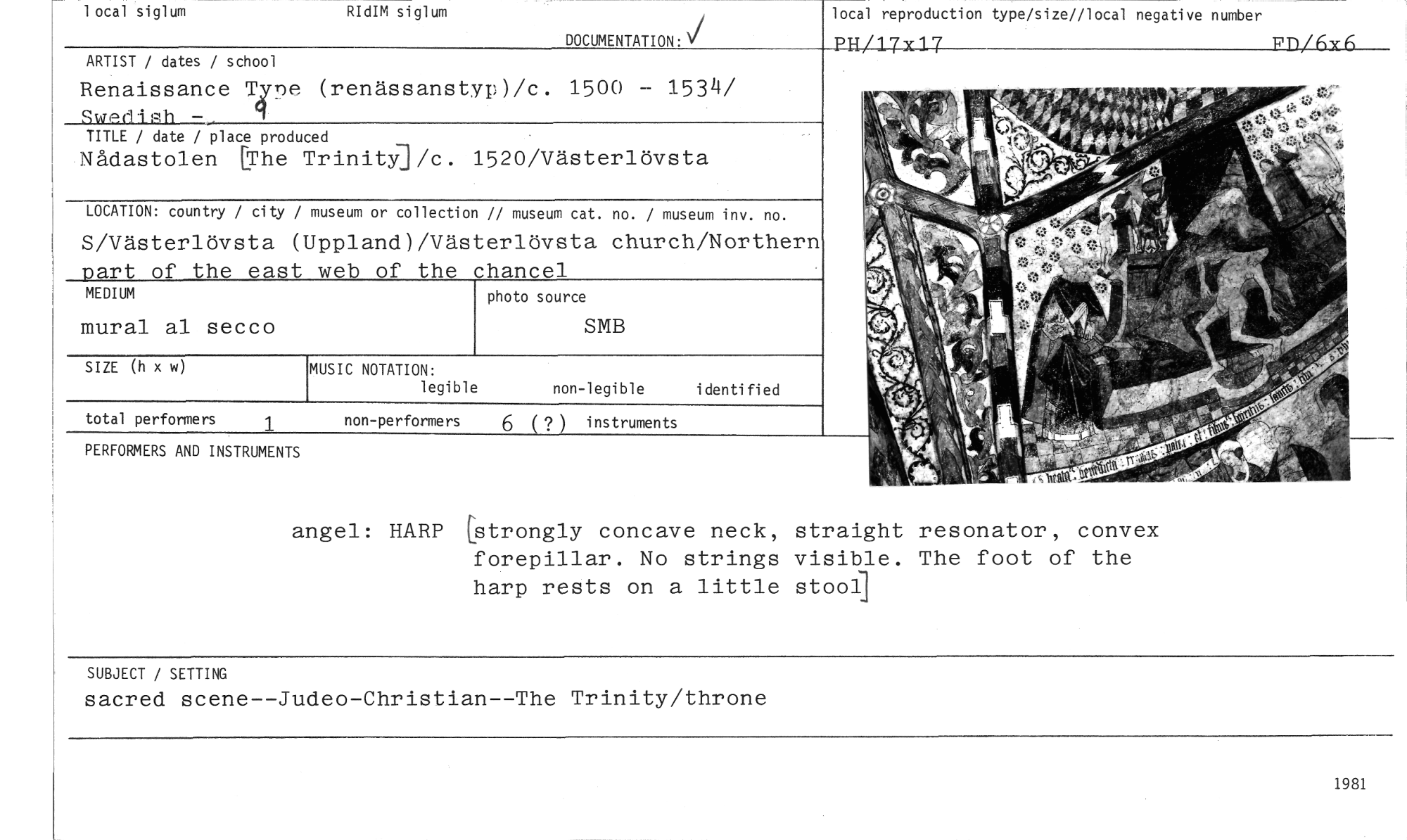 //// local reproduction type/size//local negative number //// PH/17x17___ 2-/6x6 //// 1 ocal siglum RIdIM siglum DOCUMENTATION: //// ARTIST / dates / school //// Renaissance Tee (renässanstyp)/c. 1500 - 1534/ //// TITLE / date / place produced //// Nådastolen (The TrinitYl/c. 1520/Västerlövsta //// LOCATION: country / city / museum or collection // museum cat. no. / museum inv. no. //// S/Västerlövsta (Uppland)/Västerlövsta church/Northern _part of the east web of the chancel //// MEDIUM photo source //// mural al secco SMB //// SIZE (h x w) MUSIC NOTATION: non-legible identified //// legible //// non-performers 6 (? ) instruments //// angel: HARP (strongly concave neck, straight resonator, convex forepillar. No strings visible. The foot of the harp rests on a little stool] //// SUBJECT / SETTING //// sacred scene--Judeo-Christian--The Trinity/throne //// total performers //// PERFORMERS AND INSTRUMENTS //// 1981 ////