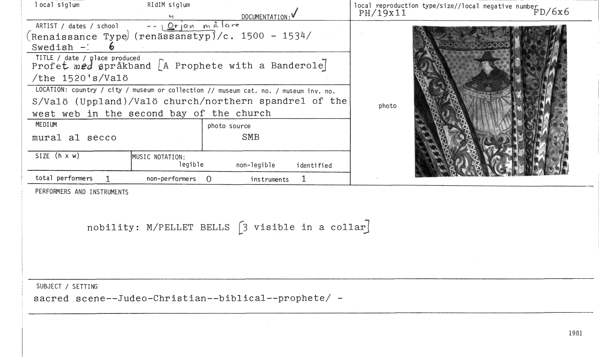 //// 1981 //// visible in a collar] //// PERFORMERS AND INSTRUMENTS //// nobility: M/PELLET BELLS //// 1 //// total performers //// DOCUMENTATION:I //// local reproduction type/size//local negative number //// PH/19x11 FD/6x6 //// ARTIST / dates / school jam rm //// Renaissance Type) (renässanstyp)/c. 1500 - 1534/ Swedish -" 6 //// TITLE / date / place produced //// Profet. med Språkband LA Prophete with a Banderole3 /the 1520's/Valö //// LOCATION: country / city / museum or collection // museum cat. no. / museum inv. no. //// S/Valö (Uppland)/Valö church/northern spandrel of the west web in the second bay of the church //// MEDIUM photo source //// mural al secco SMB //// photo //// SIZE (h x w) //// MUSIC NOTATION: //// legible //// non-legible identified //// non-performers 0 instruments 1 //// RIdIM siglum //// local siglum //// SUBJECT / SETTING //// sacred scene--Judeo—Christian--biblical--prophete/ — ////