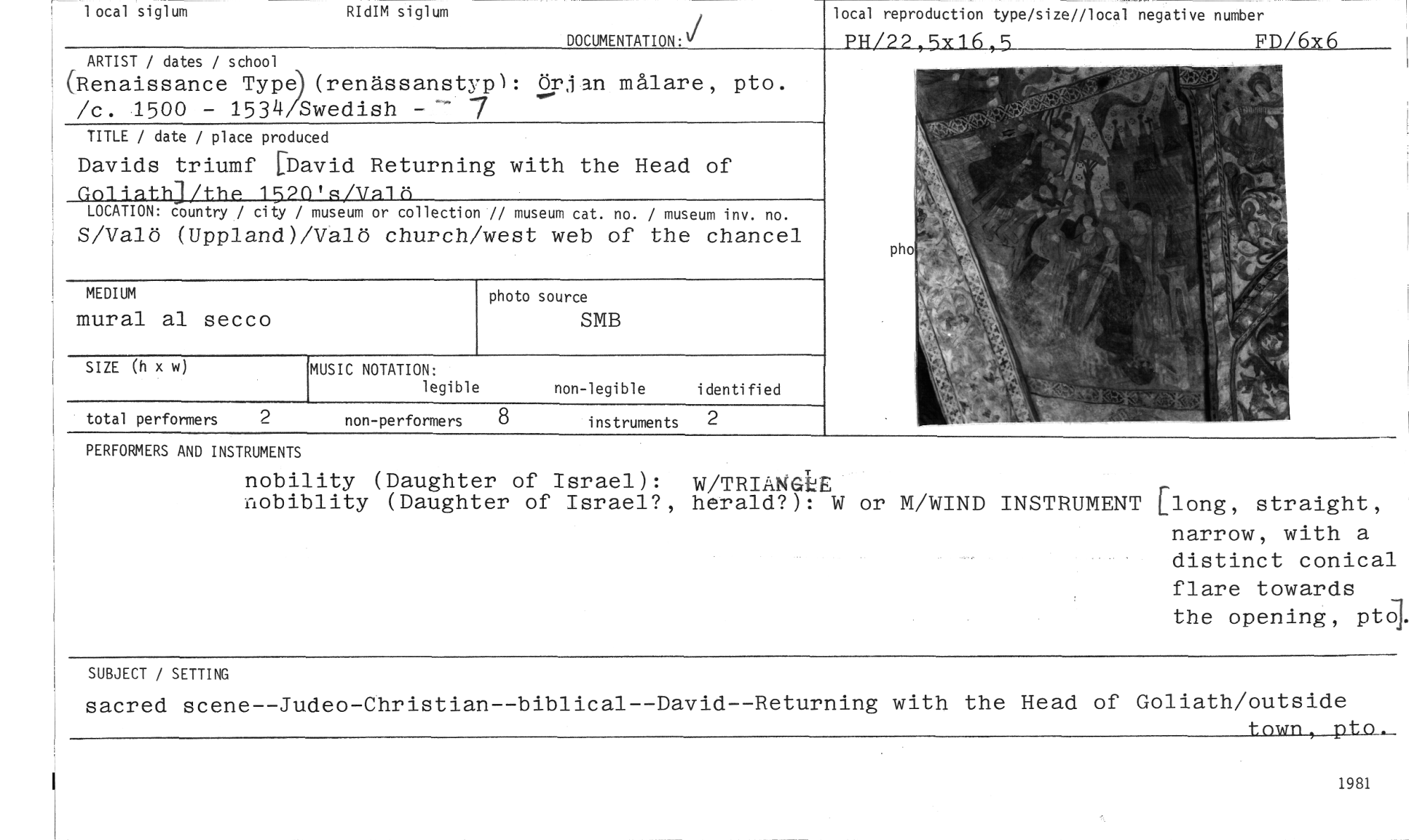 //// local siglum RIdIM siglum //// local reproduction type/size//local negative number //// 1314/22,511111,5 FD/6x6 //// ARTIST / dates / school //// (Renaissance Type)(renässanstyp): örfan målare, pto. /c. 1500 - 1534 Swedish -- 7 //// TITLE / date / place produced //// Davids triumf [David Returning with the Head of //// Goliathj/the 152WR/Valti //// LOCATION: country / city / museum or collection // museum cat. no. / museum inv. no. //// S/Valö (Uppland)/Vålö church/west web of the chancel //// ph //// DOCUMENTATION: //// SIZE (h x w) MUSIC NOTATION: //// legible non-legible identified //// total performers 2 non-performers 5 instruments 2 //// PERFORMERS AND INSTRUMENTS //// nobility (Daughter of Israel): nobiblity (Daughter of Israel?, W/TRIANGLE //// herald?): W or M/WIND INSTRUMENT [long, straight, //// narrow, with a distinct conical flare towards //// the opening, pto]. //// SUBJECT / SETTING //// sacred scene--Judeo-Christian--biblical--David--Returning with the Head of Goliath/outside //// tnwn, ptn //// MEDIUM //// mural al secco //// photo source //// SMB //// • //// 1981 ////