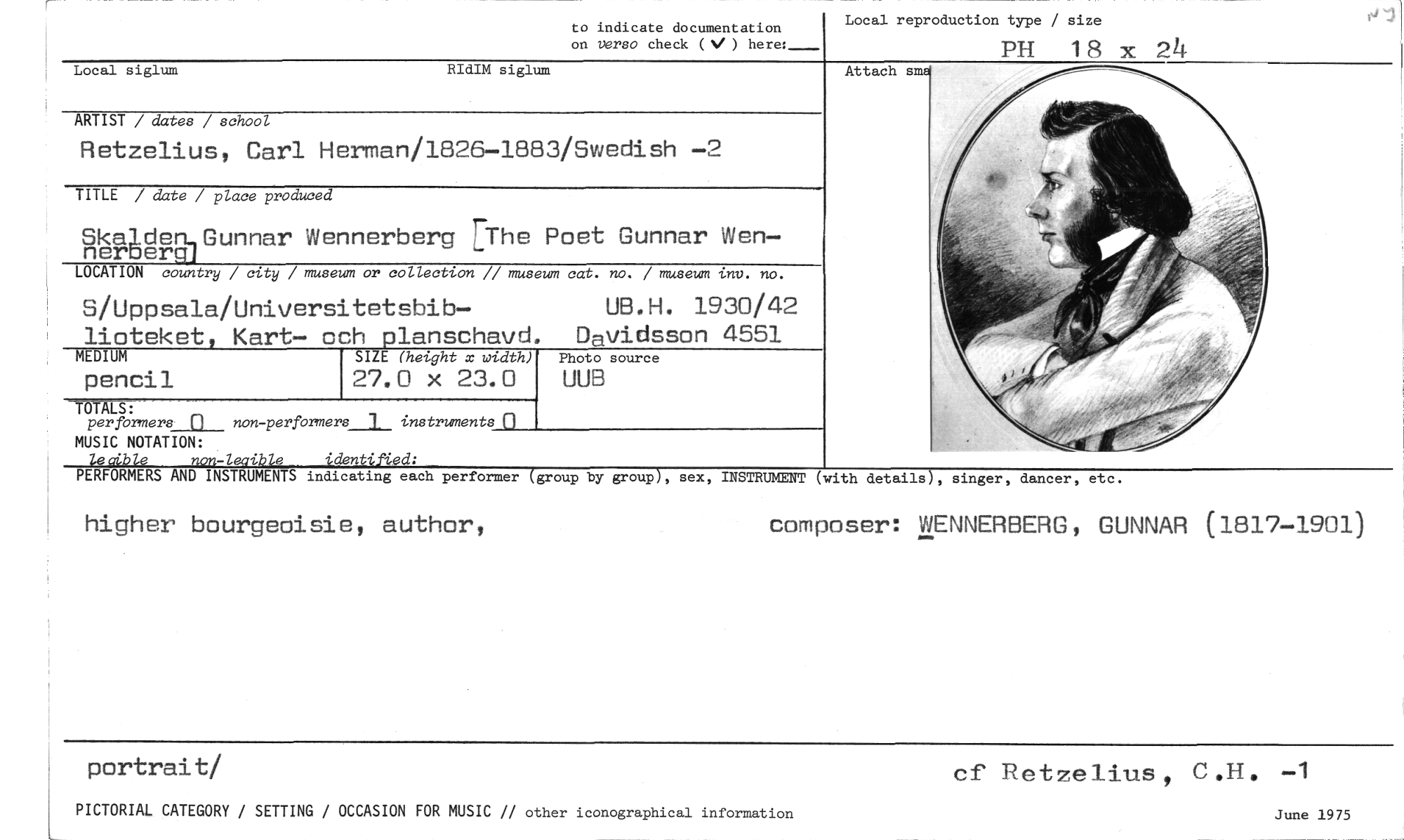 //// to indicate documentation //// on verso check (V ) here: _--- //// Local reproduction type / size //// PH 18 x 2 //// Local siglum RIdIM siglum //// ARTIST / dates / school //// Retzelius, Carl Herman/1826-1083/Swedish —2 //// TITLE / date / place produced //// Skalden-Gunnar Wennerberg rThe Poet Gunnar Wen— //// neroerpi //// LOCATION country / city / museum or collection // museum cat. no. / museum inv. no. //// S/Uppsala/Universitetsbiblioteket, Kart— och planschavd //// MEDIUM SIZE (height x width) //// pencil 27.0 x 23.0 //// per formers n non-performers_l_ instruments fl //// MUSIC NOTATION: //// lecdble non-leaible identified: //// PERFORMERS AND INSTRUMENTS indicating each performer (group by group), sex, INSTRUMENT //// higher bourgeoisie, author, composer: WENNERBERG, GUNNAR (1817-1901) //// portrait/ cf Retzelius, C.H. —1 //// PICTORIAL CATEGORY / SETTING / OCCASION FOR MUSIC // other iconographical information June 1975 //// UB.H. 1930/42 Davidsson 4551 //// Photo source //// UUB //// Attach s //// (with details , singer, dancer, etc. ////