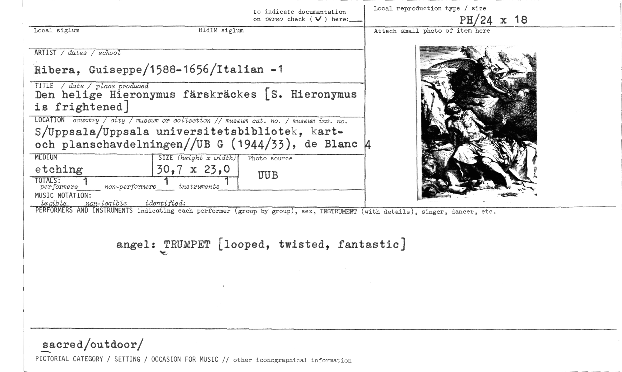 //// to indicate documentation //// on verso check (V ) here:- //// Local siglum RIdIM siglum //// Local reproduction type / size //// PH/24 x 18 //// Attach small photo of item here //// ARTIST / dates / school //// Ribera, Guiseppe/1588-1656/Italian -1 //// TITLE / date / place produced //// Den helige Hieronymus färskräckes [S. Hieronymus is frightened] //// LOCATION country / city / museum or collection // museum cat. no. / museum inv. no. //// S/Uppsala/Uppsala universitetsbibliotek, kart-och planschavdelningen//UB G (1944/33), de Blanc //// SIZE (height x width) Photo source //// 30,7 x 23,0 //// UUB //// non-performers instruments 1 //// identified: //// indicating each performer (group by group), sex, INSTRUMENT (with details), //// angel: TRUMPET [looped, twisted, fantastic] //// 4 //// MEDIUM //// etching //// 7.6"XErS: 1 //// perfbrmers //// MUSIC NOTATION: //// le eible non-legible //// PERFORMERS AND INSTRUMENTS //// singer, dancer, etc. //// sacred/outdoor/ //// PICTORIAL CATEGORY / SETTING / OCCASION FOR MUSIC // other iconographical information ////