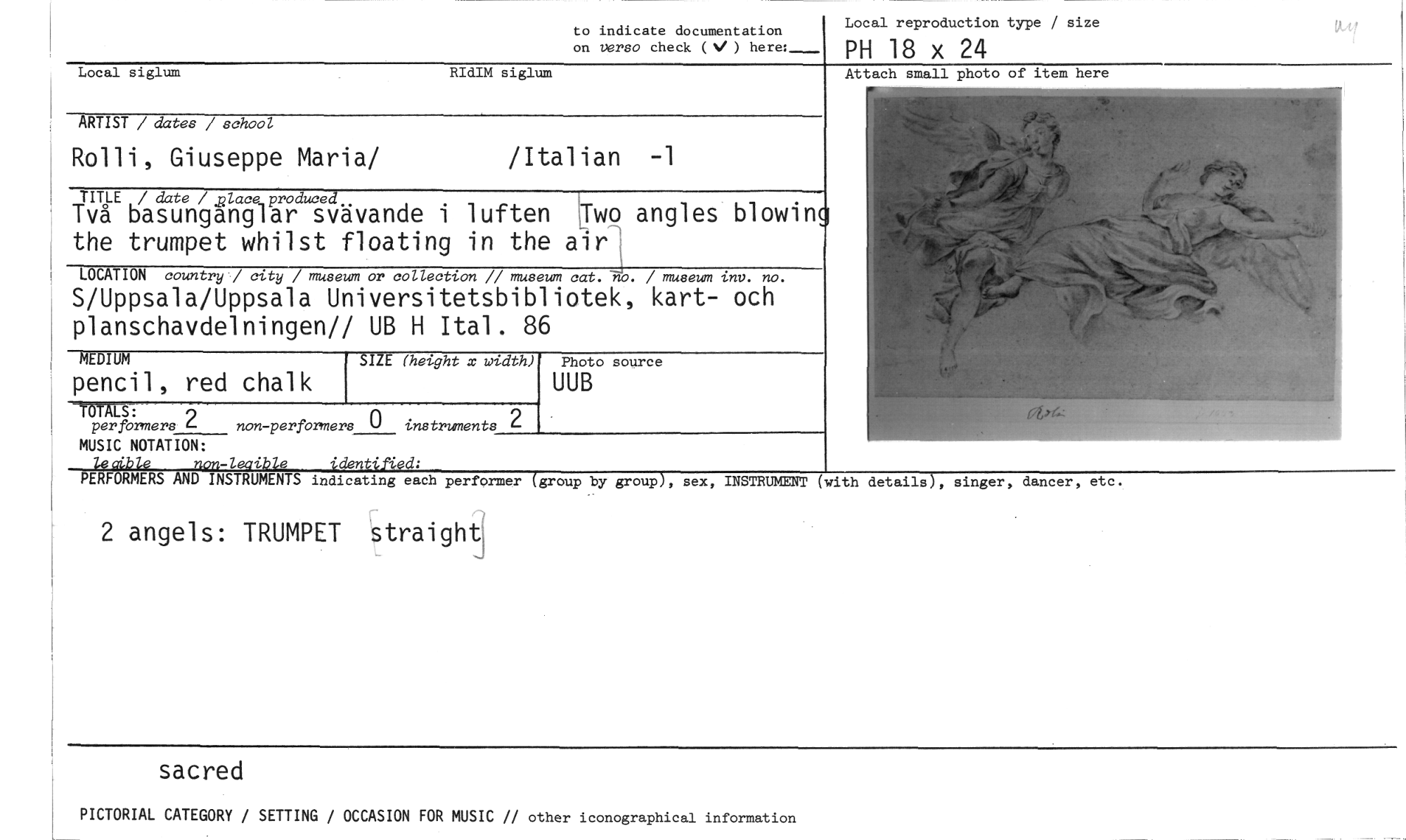 //// to indicate documentation on verso check (J) here: //// Local reproduction type / size //// PH 18 x 24 //// Attach small photo of item here //// ARTIST / dates / school //// Rolli, Giuseppe Maria/ /Italian -1 //// TITLE / date / ,place produced //// Två basunganglar svävande i luften jwo angles blowin the trumpet whilst floating in the air //// LOCATION country / city / museum or collection // museum cat. no. / museum inv. no. //// S/Uppsala/Uppsala Universitetsbibliotek, kart- och planschavdelningen// UB H Ital. 86 //// SIZE (height x width) //// -MYRS: //// per formers 2 MUSIC NOTATION: leaiblc non-leaibie identified: //// PERFORMERS AND INSTRUMENTS indicating each performer (group by group), sex, INSTRUMENT (with details), singer, dancer, etc. //// 2 angels: TRUMPET straight, //// Local siglum RIdIM siglum //// MEDIUM //// pencil, red chalk //// non-per formers 0 instruments //// Photo source //// UUB //// sacred //// PICTORIAL CATEGORY / SETTING / OCCASION FOR MUSIC // other iconographical information ////
