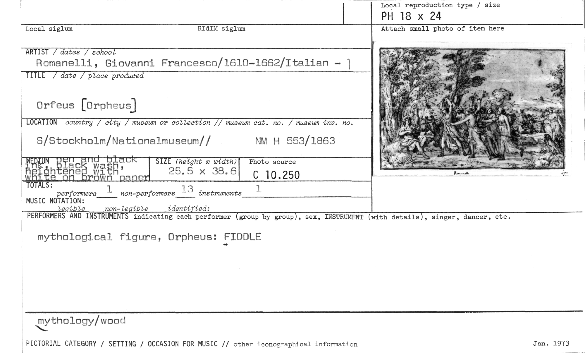 //// Local reproduction type / size //// PH 18 x 24 //// Local siglum //// RIdIM siglum Attach small photo of item here //// ARTIST / dates / school //// Romanelli, Giovanni Francesco/1610-1662/Italian - 1 //// TITLE / date / place produced //// Orfeus [Orpheus] //// LOCATION country / city / museum or collection // museum cat. no. / museum inv. no. //// S/Stockholm/Nationalmuseum// NM H 553/1863 //// FWc //// h ene //// . //// performers 1 13 non-performers instruments //// MUSIC NOTATION: //// legible non-legible identified: //// PERFORMERS AND INSTRUMENTS indicating each performer (group by group), sex, INSTRUMENT (with details), singer, dancer, etc. //// mythological figure, Orpheus: FIODLE //// mythology/wood //// PICTORIAL CATEGORY / SETTING / OCCASION FOR MUSIC // other iconographical information Jan. 1973 //// nu black //// SIZE (height x width) //// 25.5 x 38.6 //// Photo source //// C 10.250 //// 1 ////