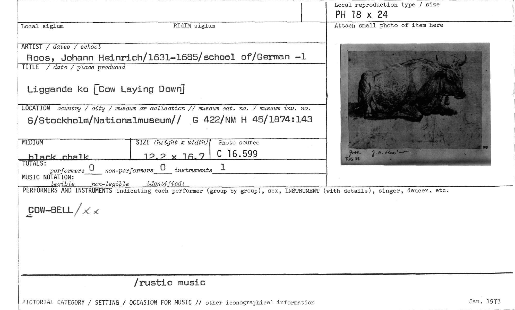 //// Jan. 1973 //// /rustic music //// PICTORIAL CATEGORY / SETTING / OCCASION FOR MUSIC // other iconographical information //// Local siglum RIdIM siglum //// Local reproduction type / size //// PH 18 x 24 //// ARTIST / dates / school //// Roos, Johann Heinrich/1631-1685/school of/German —1 //// TITLE / date / place produced //// Liggande ko [dow Laying Down] //// LOCATION country / city / museum or collection // museum cat. no. / museum int,. no. //// S/Stockholm/Nationalmuseum// G 422/NM H 45/1874:143 //// MEDIUM //// - //// TOTALS: //// performers //// MUSIC NOTATION: //// Le ible non-le ible identi ied: //// PERFORMERS AND INSTRUMENTS indicating each performer (group by group), sex, INSTRUMENT (with details), singer, dancer, etc. //// SIZE (height x width) //// Attach small photo of item here //// Photo source //// C 16.599 //// non-performers instruments 1 //// 20W—BELL/X ////