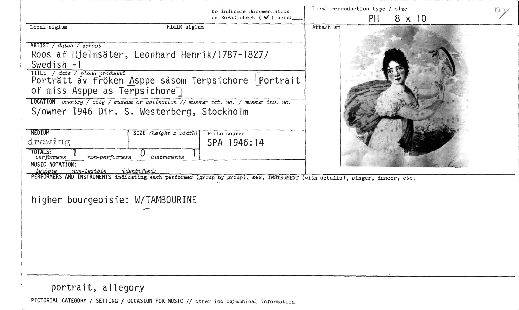 //// to indicate documentation on Versa check (N/ ) //// Local reproduction type / size //// PH 8 x 10 //// Local siglum RIdIM siglum //// ARTIST / dates / school //// Roos af Hjelmsäter, Leonhard Henrik/1787-1827/ Swedish -1 //// TITLE / date / place produced //// Porträtt av fröken Asppe såsom Terpsichore LPortrait of miss Asppe as Terpsichore //// LOCATION country / city / museum or collection // museum cat. no. / museum inv. no. //// S/owner 1946 Dir. S. Westerberg, Stockholm //// MEDIUM SIZE (height x width) Photo source //// drawing SPA 1946 : 14 //// S: //// per formers non-performers instruments //// MUSIC NOTATION: //// lecrible non-leaible identified: //// PERFORMERS AND INSTRUMENTS indicating each performer (group by group), sex, INSTRUMENT (with details), singer, dancer, etc. //// higher bourgeoisie: W/TAMBOURINE //// portrait, allegory //// PICTORIAL CATEGORY / SETTING / OCCASION FOR MUSIC // other iconographical information //// Attach s ////