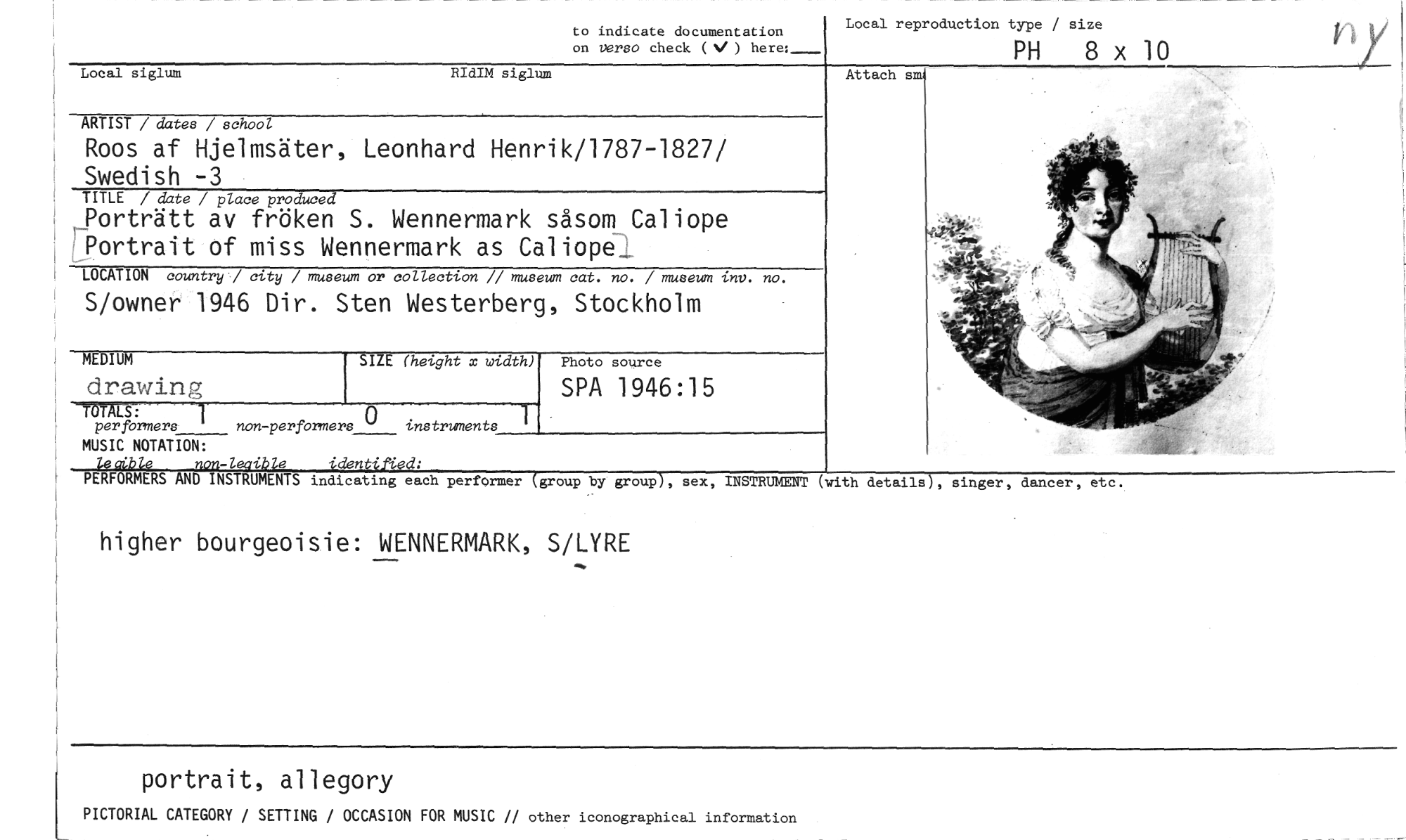 //// to indicate documentation on verso check ( ) here: //// Local siglum RIdIM siglum //// Local reproduction type / size //// PH 8 x 10 //// Attach s //// ARTIST / dates / school //// Roos af Hjelmsäter, Leonhard Henrik/1787-1827/ Swedish -3 //// TITLE / date / place produced //// „Porträtt av fröken S. Wennermark såsom Caliope LPortrait of miss Wennermark as Caliopel //// LOCATION country / city / museum or collection // museum cat. no. / museum inv. no. //// S/owner 1946 Dir. Sten Westerberg, Stockholm //// SIZE (height x width) //// -TÖTALS: 1 //// per formers non-per formers instruments //// MUSIC NOTATION: //// lectible non-lelible //// PERFORMERS AND INSTRUMENTS indicating each performer (group by group-Y, sex, INSTRUMENT (with details), singer, dancer, etc. //// higher bourgeoisie: WENNERMARK, S/LYRE //// portrait, allegory //// PICTORIAL CATEGORY / SETTING / OCCASION FOR MUSIC // other iconographical information //// MEDIUM //// drawing //// Photo source //// SPA 1946:15 ////