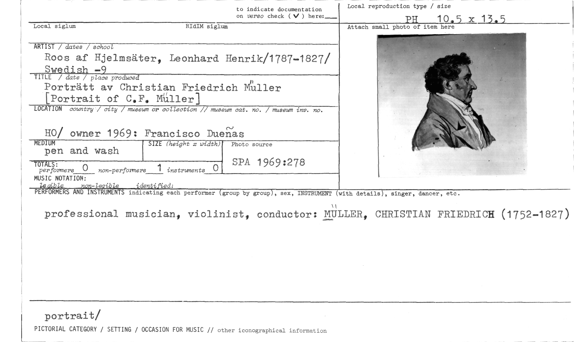 //// Local reproduction type / size //// to indicate documentation //// on versa check ( ) here; //// PR 10.5 x 13.5 //// Local siglum RIdIM siglum //// ARTIST / dates / school //// Roos af Hjelmsäter„ Leonhard Henrik/1787-1827/ //// Swedish —9 //// TITLE / date / place produced //// Porträtt av Christian Friedrich giller [Portrait of C.F. MUller] //// LOCATION country / city / museum or collection // museum cat. no. / museum inv. no. //// HO/ owner 1969: Francisco Duei-l'as //// MEDIUM SIZE (height x width) Photo source //// pen and wash //// SPA 1969:278 //// TOTALS: //// per formers 0 non-performers 1 instruments //// MUSIC NOTATION: //// 'den ied: //// PERFORMERS AND INSTRUMENTS indicating each performer (group by group), sex, INSTRUMENT (with details), singer, dancer, etc. //// professional musician, violinist, conductor: MULLER, CHRISTIAN FRIEDRICH (1752-1827) //// portrait/ //// PICTORIAL CATEGORY / SETTING / OCCASION FOR MUSIC // other iconographical information //// ' • //// Attach small photo of item here ////