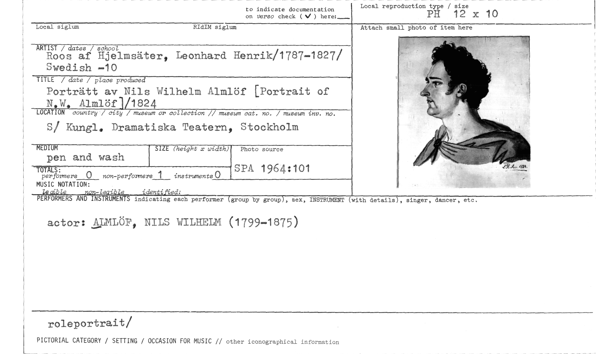 //// to in disate documentation //// Local reproduction type / size //// on verso check (Ni ) PH 12 X 10 //// Local siglum RIdIM siglum //// Attach small photo of item here //// ARTIST / dates / school //// Roos af Hjelmsäter, Leonhard Henrik/1787-1827/ Swedish —10 //// TITLE / date / place p oduced //// Porträtt av Nils Wilhelm Almlöf [Portrait of N,W„ Almlöf]/1824 //// LOCATION country/ city / museum or collection // museum cat. no. / museum inv. no. //// S/ Kungl, Dramatiska Teatern, Stockholm //// SIZE (height x width) //// per formers 0 non-per formers 1 instruments //// MUSIC NOTATION: //// lecible identified: //// PERFORMERS AND INSTRUMENTS indicating each performer (group by group), sex, INSTRUMENT //// actor: ALMLÖP, NILS WILHELM (1799-1875) //// roleportrait/ //// PICTORIAL CATEGORY / SETTING / OCCASION FOR MUSIC // other iconographical information //// MEDIUM //// pen and wash //// Photo source //// SPA 1964:101 //// (with details , singer, dancer, etc. ////