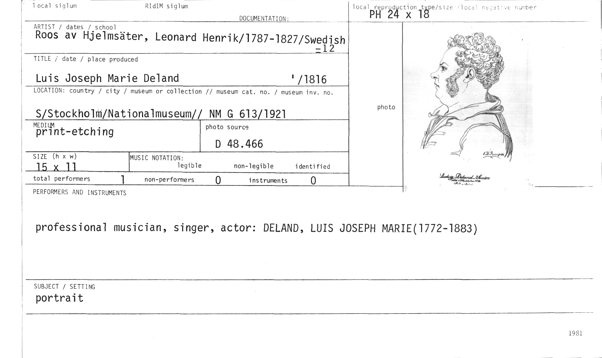 //// 1 ocal siglum RIdIM siglum //// DOCUMENTATION. //// lotal reproduction1 t e/size•ilocal number //// PH 24 x //// ARTIST / dates / school //// Roos av Hjelmsäter, Leonard Henrik/1787-1827/Swedish //// -12 //// TITLE / date / place produced //// Luis Joseph Marie Deland 71816 //// LOCATION: country / city / museum or collection // museum cat. no. / museum inv. no. //// S/Stockholm/Nationalmuseum// NM G 613/1921 //// MEDIUM print-etching //// D 48.466 //// MUSIC NOTATION: //// legible non-legible identified //// photo source //// SIZE (h x w) //// 15 x 11 //// photo //// total performers 1 non-performers instruments 0 //// PERFORMERS AND INSTRUMENTS //// professional musician, singer, actor: DELAND, LUIS JOSEPH MARIE(1772-1883) //// SUBJECT / SETTING //// portrait //// 1981 ////