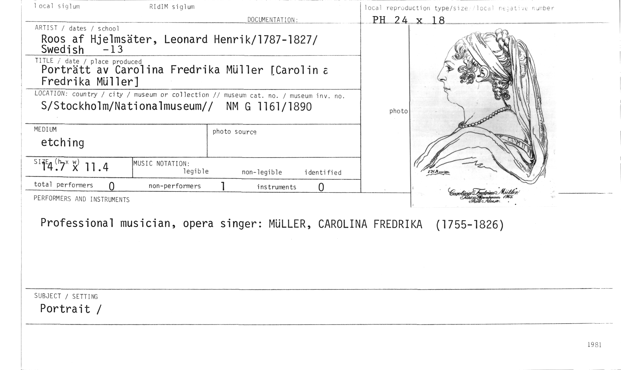 //// 1 ocal siglum //// RIdIM siglum //// DOCUMENTATION: //// local reproduction type/size•local ne;:at,ae nurober //// PH 2 1 fi //// photo //// ARTIST / dates / school //// Roos af Hjelmsäter, Leonard Henrik/1787-1827/ Swedish -13 //// TITLE / date / place produced //// Porträtt av Carolina Fredrika MUller [Carolin a Fredrika MUller] //// LOCATION: country / city / museum or collection // museum cat. no. / museum inv. no. //// S/Stockholm/Nationalmuseum// NM G 1161/1890 //// MEDIUM //// etching //// MUSIC NOTATION: //// legible non-legible identified //// total performers 0 non-performers instruments 0 //// PERFORMERS AND INSTRUMENTS //// si1E4(h7x52 11.4 //// photo source //// Professional musician, opera singer: MULLER, CAROLINA FREDRIKA (1755-1826) //// SUBJECT SETTING //// Portrait / //// 1981 ////