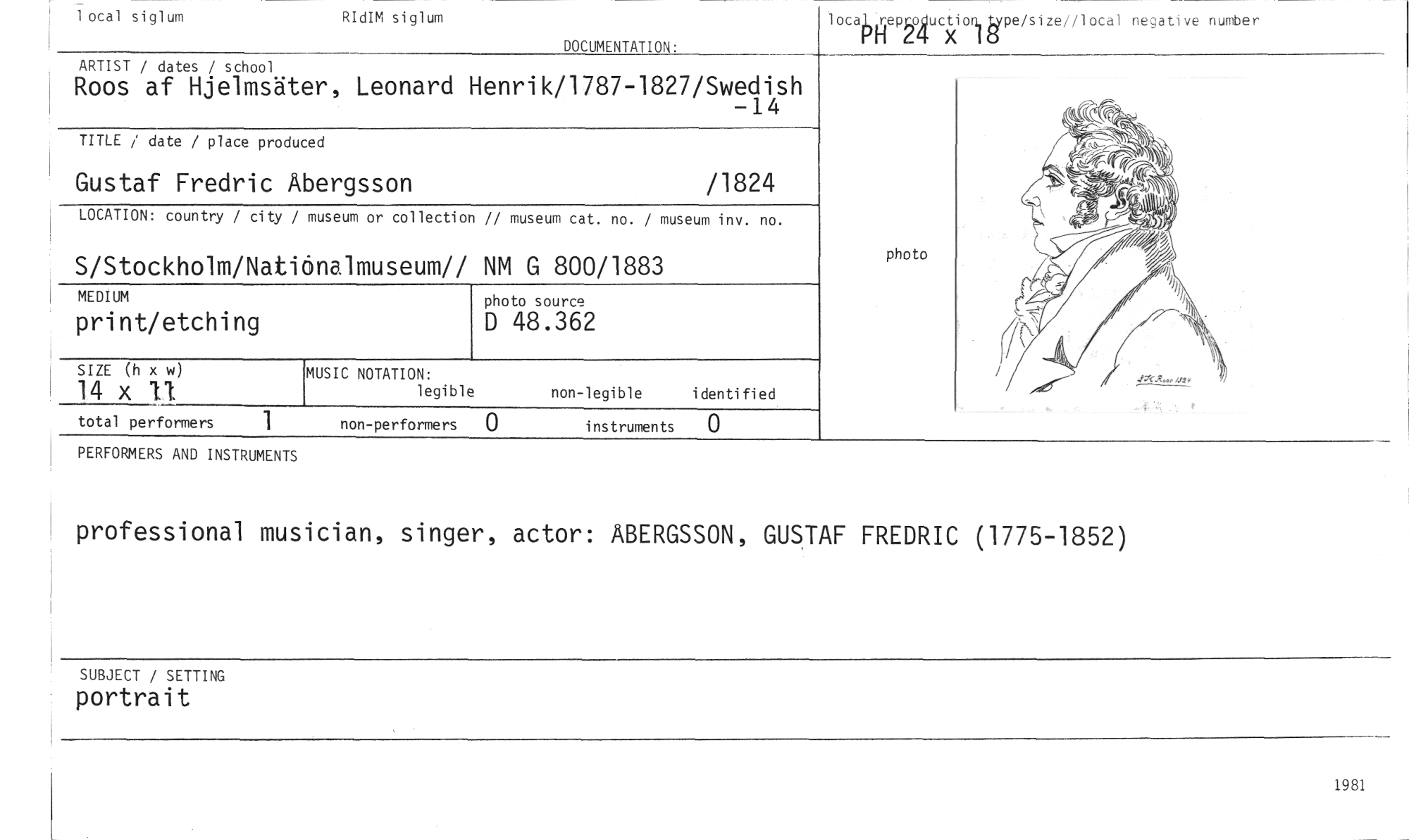 //// ' 1 ocal siglum RIdIM siglum DOCUMENTATION: fota] re L2oduction_1 n //// tYpe/sizelocal negative number //// 4 x //// //// ARTIST / dates / school //// Roos af Hjelmsäter, Leonard Henrik/1787-1827/Swedish //// TITLE / date / place produced //// Gustaf Fredric Abergsson /1824 //// LOCATION: country / city / museum or collection // museum cat. no. / museum inv. no. //// S/Stockholm/Natiönalmuseum// NM G 800/1883 //// MEDIUM //// print/etching //// SIZE (h x w) //// 14 x 11 //// total performers 1 non-performers 0 instruments 0 //// photo source //// D 48.362 //// MUSIC NOTATION: //// legible non-legible identified //// photo //// //// PERFORMERS AND INSTRUMENTS //// professional musician, singer, actor: ABERGSSON, GUSTAF FREDRIC (1775-1852) //// SUBJECT / SETTING //// portrait //// 1981 ////