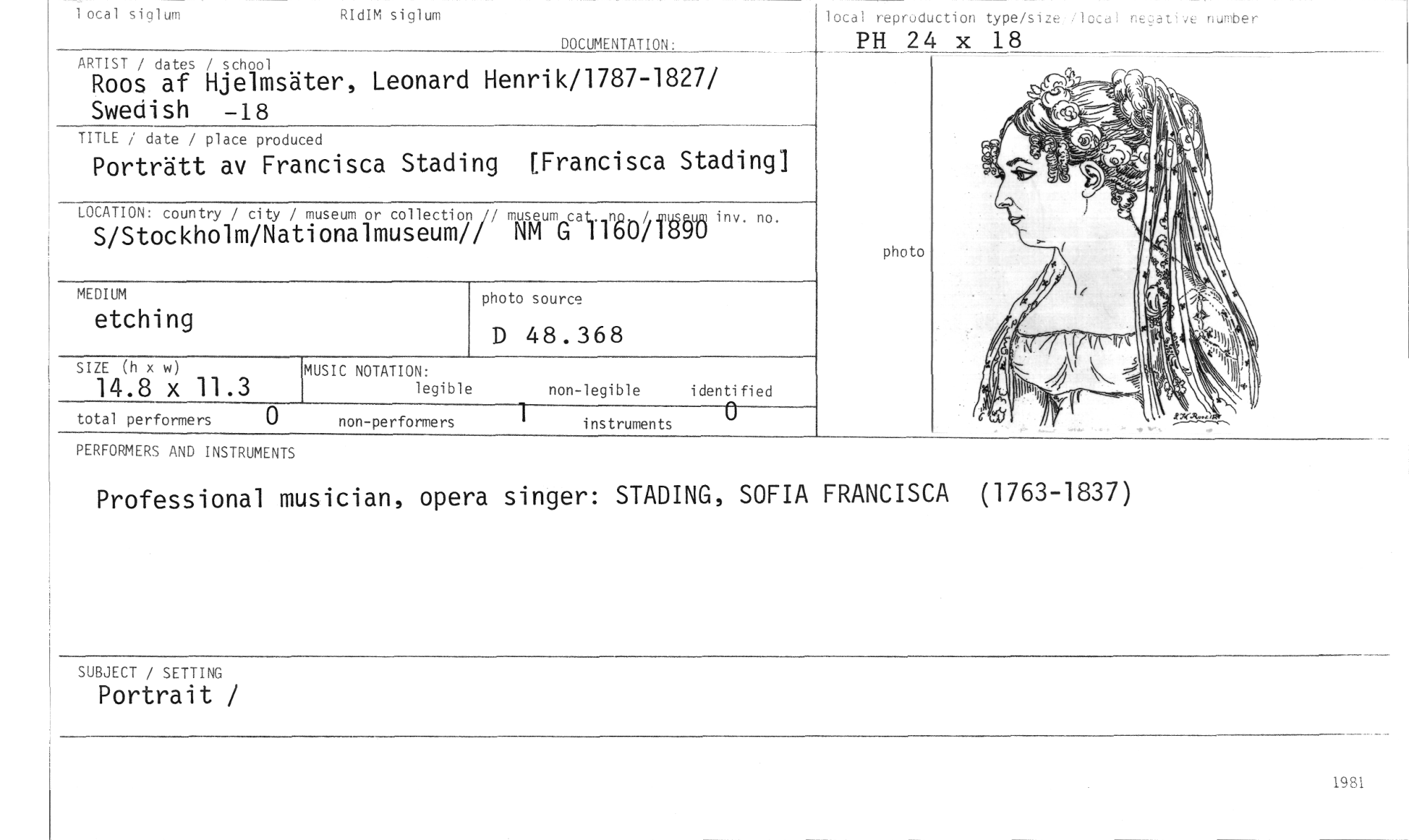//// lotal siglum //// RIdIM siglum //// DOCUMENTATION: //// ARTIST / dates / school //// Roos af Hjelmsäter, Leonard Henrik/1787-1827/ Swedish -18 //// lotal reproduction type/size local negative number //// PH 24 x 18 //// TITLE / date / place produced //// Porträtt av Francisca Stading [Francisca Stading] //// LOCATION: country / city / museum or collection/ museum ca t n //// P / nv. no. //// S/Stockholm/Nationalmuseum// NM G 1160/246 //// photo //// MEDIUM //// etching //// photo source //// D 48.368 //// SIZE (h x w) //// 14.8 x 11.3 //// MUSIC NOTATION: //// legible non-legible identified //// total performers 0 //// non-performers 1 instruments 0 //// RERFOMIERS AND INSTRUMENTS //// Professional musician, opera singer: STADING, SOFIA FRANCISCA (1763-1837) //// SUBJECT / SETTING //// Portrait / //// 1981 ////