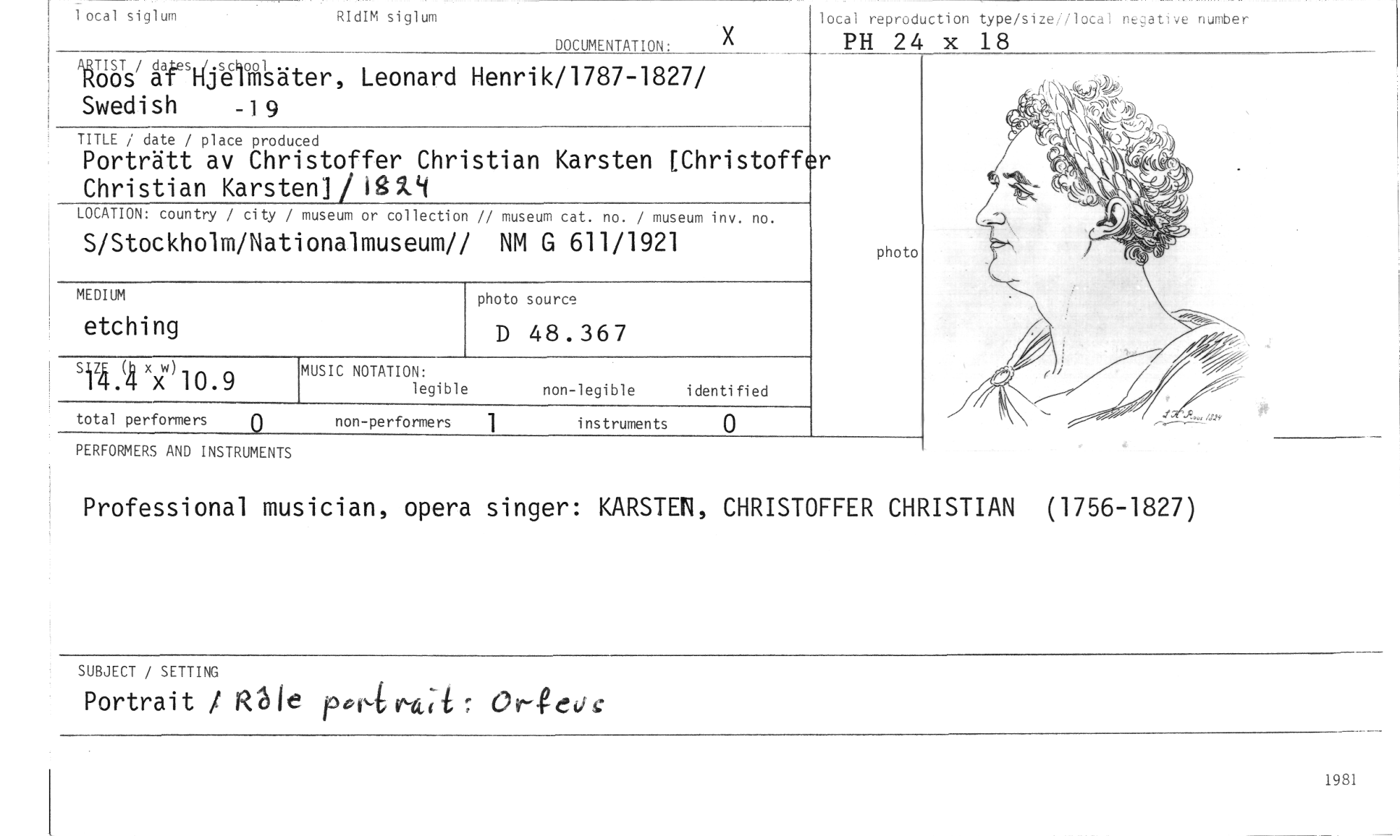 //// Professional musician, opera singer: KARSTEN, CHRISTOFFER CHRISTIAN (1756-1827) //// SUBJECT / SETTING //// Portrait i Rå le loPoi rtä 7 0r eil //// 1981 //// enl/ //// `öos åi`~St-jeim'sä //// Swedish -19 //// TITLE / date / place produ //// Porträtt av Chr //// Christian Karst //// LOCATION: country / city / //// S/Stockholm/Nat //// 0 //// total performers //// 1 //// 0 //// non-performers //// instruments //// 1 otal siglum //// RIdIM siglum //// DOCUMENTATION. //// lotal reproduction type/size//local negative number //// PH 24 x 18 //// MEDIUM //// etching siz4.(4 xxw) 10.9 //// photo source //// D 48.367 //// er //// photo //// ter, Leonard Henrik/1787-1827/ //// ced //// istoffer Christian Karsten (Christoff //// museum or collection // museum cat. no. / museum inv. no. //// ionalmuseum// NM G 611/1921 //// MUSIC NOTATION: //// legible non-legible identified //// PERFORMERS AND INSTRUMENTS ////