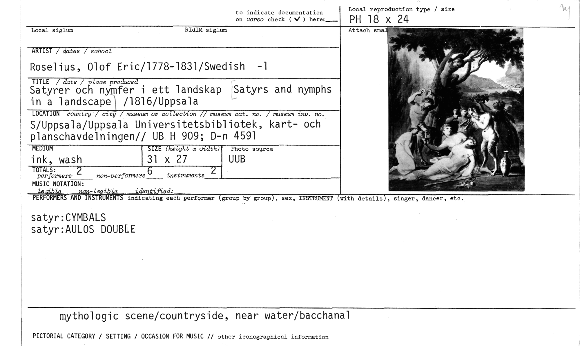 //// to indicate documentation //// on verso check ( ) here:_ //// Local reproduction type / size //// PH 18 x 24 //// Local siglum RIdIM siglum //// ARTIST / dates / school //// Roselius, Olof Eric/1778-1831/Swedish -1 //// TITLE / date /place produced //// Satyrer och nymfer i ett landskap Satyrs and nymphs in a landscape\ /1816/Uppsala //// LOCATION country / / museum or collection // museum cat. no. / museum inv. no. //// S/Uppsala/Uppsala Universitetsbibliotek, kart- och planschavdelningen// UB H 909; D-n 4591 //// MEDIUM SIZE (height x width) Photo source //// ink, wash 31 x 27 UUB //// Attach SIDA //// TOTALS: 2 //// per formers non -performers 6 instruments 2 //// MUSIC NOTATION: //// le cible non-leaible identified: //// PERFORMERS AND INSTRUMENTS //// satyr:CYMBALS satyr:AULOS DOUBLE //// INSTRUMENT (with //// details), singer, dancer, etc. //// indicating each performer (group by group), sex, //// mythologic scene/countryside, near water/bacchanal //// PICTORIAL CATEGORY / SETTING / OCCASION FOR MUSIC // other iconographical information ////