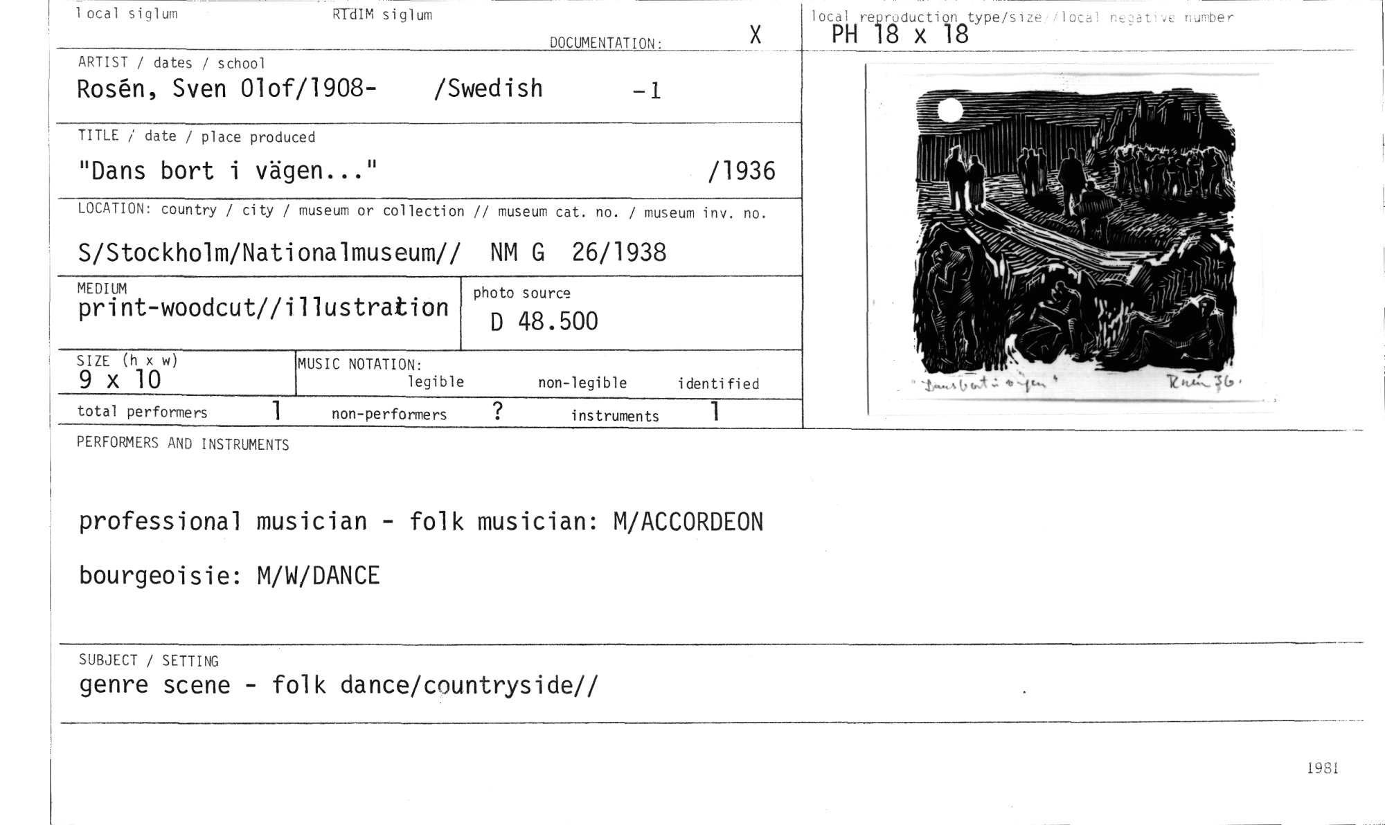//// SUBJECT / SETTING //// genre scene - folk dance/countryside// //// RTdIM siglum //// - — //// 1 otal siglum //// DOCUMENTATION: //// X //// lotal reproduction18 type/sizeilocal negative nutuber //// PH 18 x //// ARTIST / Jates / school //// Rosen, Sven Olof/1908- /Swedish -1 //// TITLE / date / place produced //// "Dans bort i vägen..." /1936 //// LOCATION. country / city / museum or collection // museum cat. no. / museum inv. no. //// S/Stockholm/Nationalmuseum// NM G 26/1938 //// MEDIUM //// print-woodcut//illustration //// photo source //// D 48.500 //// SIZE (h x //// x 10 //// MUSIC NOTATION: //// legible //// non-legible ident fied //// instruments 1 //// PERFORMERS AND INSTRUMENTS //// professional musician - folk musician: M/ACCORDEON //// bourgeoisie: M/W/DANCE //// 1981 ////