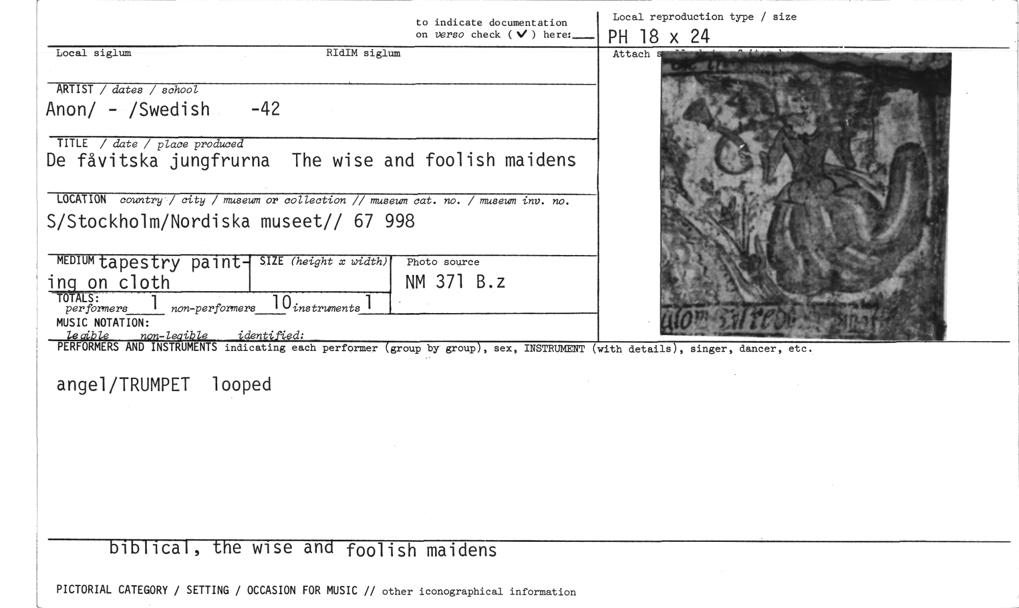 //// to indicate documentation //// on versa check (V ) here:_ //// Local reproduction type / size //// PH 18 x 24 //// Attach //// ARTIST / dates / school //// Anon/ - /Swedish //// TITLE / date / place produced //// De fåvitska jungfrurna The wise and foolish maidens //// LOCATION country / city / museum or collection // museum cat. no. / museum inv. no. //// S/Stockholm/Nordiska museet// 67 998 //// MEDIUM tapestry pai nt- SIZE (height x width) Photo source //// ing on cloth NM 371 B.z //// TOTALS: //// per formers 1 non-perfbrmers 1 ()instruments //// MUSIC NOTATION: //// lecfbie non-leaible identifi.ed; //// PERFORMERS AND INSTRUMENTS indicating each performer (group by group), sex, INSTRUMENT (with details), singer, dancer, etc. //// angel/TRUMPET looped //// biblical, the wise and foolish maidens //// PICTORIAL CATEGORY / SETTING / OCCASION FOR MUSIC // other iconographical information ////