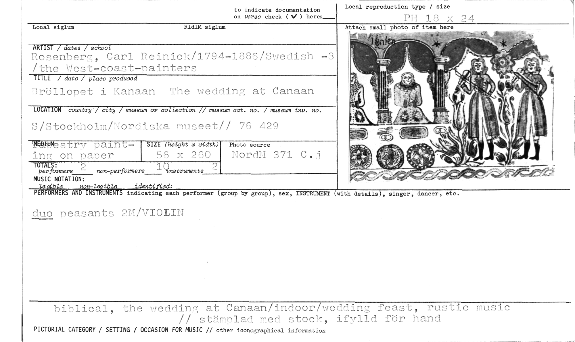 //// to indicate documentation Local reproduct on type / size //// on versa check (V ) here:_--- PH 18 x 24 //// Local siglum RIdIM siglum //// ARTIST / dates / school //// Rosenberg, Carl Reinick/1794-1886/Swedish -3 /the West-coast-painters //// TITLE / date / place produced //// Bröllopet i Kanaan The wedding at Canaan //// LOCATION country / city / museum or collection // museum cat. no. / museum inv. no. //// S/Stockholm/Nordiska museet!! 76 429 //// Attach small //// 19~stry paint- SIZE (hetght x uidth) Photo source //// ing on lianer 56 x 260 NordLI 371 C.j //// TOTAL5: //// per formers non-performers 1-Q //// 2 nstruments //// MUSIC NOTATION: //// Asyi.ble non-leagle identined: //// PERFORMERS AND INSTRUMENTS indicating each performer (group by group), sex, INSTRUMENT //// duo neasants 2M/VIOLIN //// (with details), singer, dancer, etc. //// biblical, the wedding at Canaan/indoor/weddinc feast, rustic music // stämplad med stock, ifylld för hand //// PICTORIAL CATEGORY / SETTING / OCCASION FOR MUSIC // other iconographical information ////
