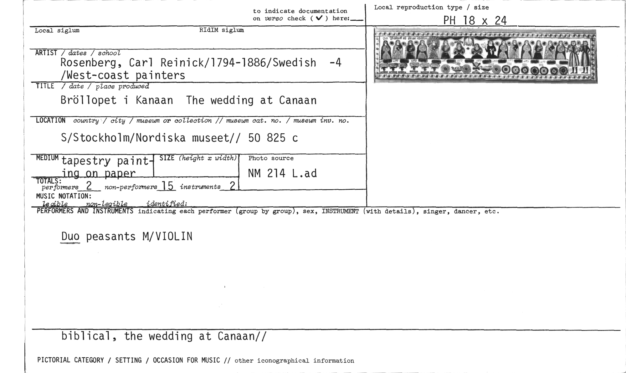 //// to indicate documentation //// on verso check (Y' ) here:- //// Local reproduction type / size //// PH 18 x 24 //// Local siglum RIdIM siglum //// ARTIST / dates / school //// Rosenberg, Carl Reinick/1794-1886/Swedish -4 /West-coast painters //// TITLE / date / place produced //// Bröllopet i Kanaan The wedding at Canaan //// LOCATION country / city / museum or collection // museum cat. no. / museum inv. no. //// S/Stockholm/Nordiska museet// 50 825 c //// MEDIUM tapestry paint- SIZE (height x mIdth) //// 'ng on papPr //// perfbrmers 2 non-performers 15 instruments 2 MUSIC NOTATION: //// lecible non-legible identified: //// Photo source //// NM 214 L.ad //// iTdx 4.1, „t74. • • r r rr . • or r r 0, - 7 . -r, , r r 7 e...;7'ii ' ;1;-^.1`..4 .11, /JÄV` //// ' //// t. , . 4711 , //// i i 44 4 , a //// ,•1,, a ,a i //// 2 4 4 • //// .•..,...:..3111, . //// .Nåde e. CA iffle IM //// . //// W //// *.e.r 4 fer"le ...,rrr e "lbr-4,0 '• _ a r, r. //// PERFORMERS AND INSTRUMENTS indicating each performer (group by group), sex, INSTRUMENT (with details), singer, dancer, etc. //// Duo peasants M/VIOLIN //// biblical, the wedding at Canaan// //// PICTORIAL CATEGORY / SETTING / OCCASION FOR MUSIC /7 other iconographical information ////