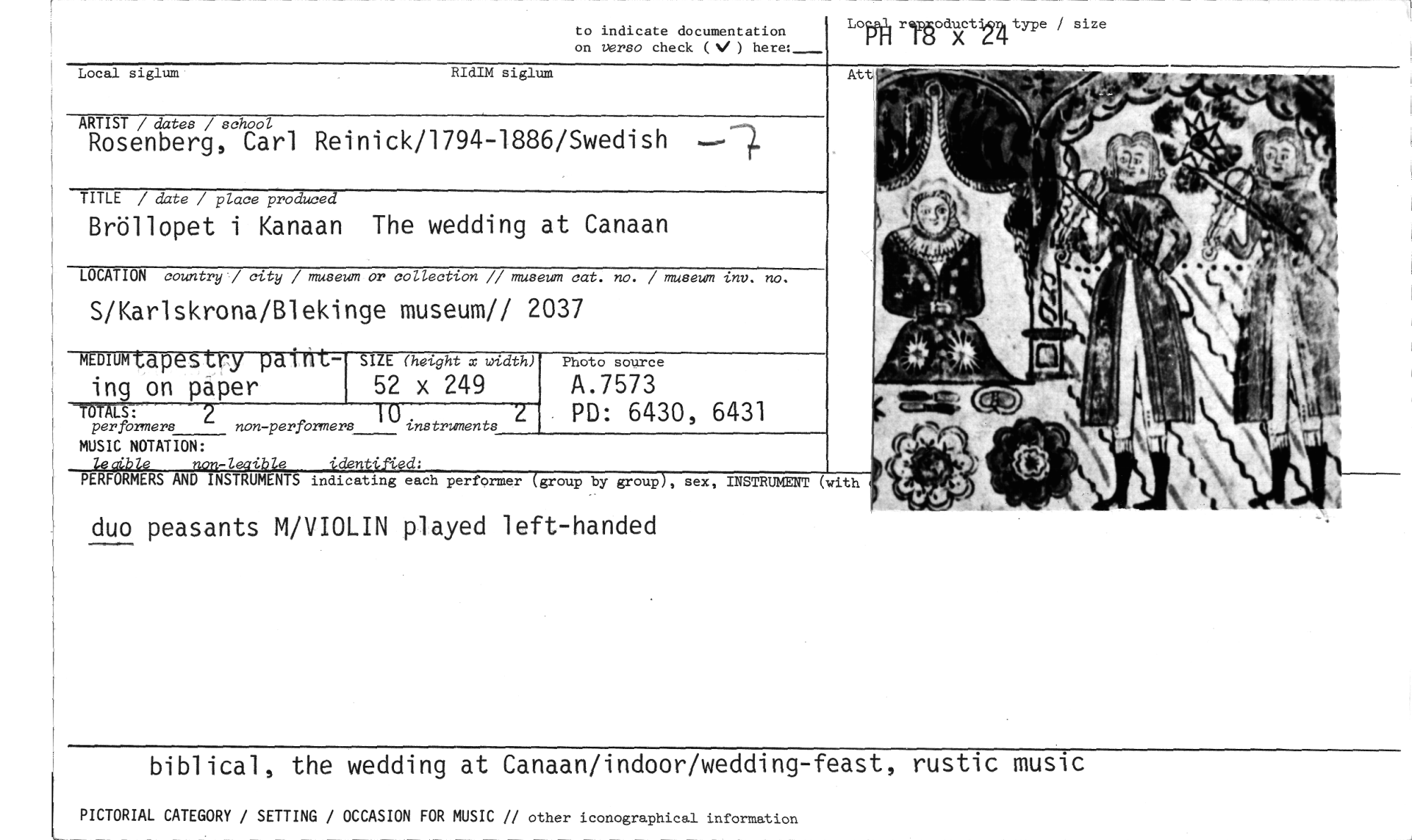 //// biblical, the wedding at Canaan/indoor/wedding-feast, rustic music //// [ PICTORIAL CATEGORY / SETTING / OCCASION FOR MUSIC // other iconographical information //// to indicate documentation on verso check (V ) //// Logi risoItA22Etype / size //// Local siglum RIdIM siglum //// ARTIST / dates / school //// Rosenberg, Carl Reinick/1794-1886/Swedish //// TITLE / date / place produced //// Bröllopet i Kanaan The wedding at Canaan //// LOCATION country / city / museum or collection // museum cat. no. / museum inv. no. //// S/Karlskrona/Blekinge museum// 2037 //// Att //// DIU ap Y e . IZE (height x width) //// ing on påper 52 x 249 //// -MALS:- 2 —10 //// per formers non-perfbrmers instruments //// MUSIC NOTATION: //// ledble non-leaible identified: //// PERFORMERS AND INSTRUMENTS indicating each performer (group by group), sex, INSTRUMENT //// (with //// t ti //// duo peasants M/VIOLIN played left-handed //// Photo source //// A.7573 //// PD: 6430, 6431 ////