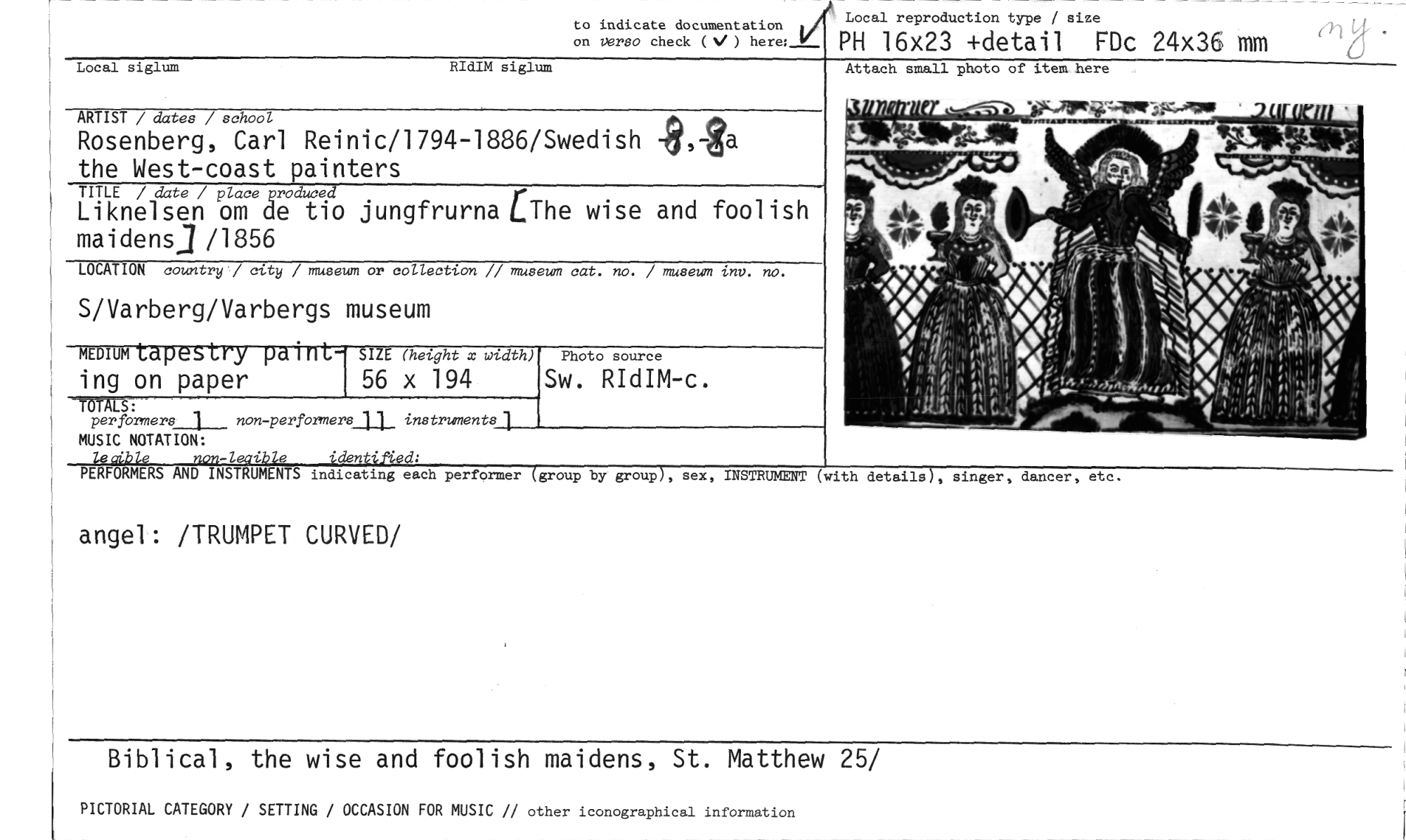//// Local siglum //// RIdIM siglum //// Attach small photo of item here //// Local reproduction type / size //// MaIST/clates/s~ //// Rosenberg, Carl Reinic/1794-1886/Swedish tia the West-coast painters //// TITLE /date/place~ed //// Liknelsen om de tio jungfrurnad:The wise and foolish maidens] /1856 //// LOCATION country / city / museum or collection // museum cat. no. / museum inv. no. //// S/Varberg/Varbergs museum //// Photo source //// Sw. RIdIM-c. //// on verso check ( ) PH 16x23 +detail FDc 24x36 mm //// to indicate documentation //// TOTALS: //// perfbrmers 1 _ non-performers_11_ instruments 1 //// MUSIC NOTATION: //// -/ i e 'den 'ed: //// PERFORMERS AND INST UMENTS indicating each performer group by group , sex, INSTRUMENT (with details), singer, dancer, etc. //// angel: /TRUMPET CURVED/ //// Biblical, the wise and foolish maidens, St. Matthew 25/ //// PICTORIAL CATEGORY / SETTING / OCCASION FOR MUSIC // other iconographical information //// mommtapes ry pdint- //// ing on paper //// sur (height x width) //// 56 x 194 //// :il ////