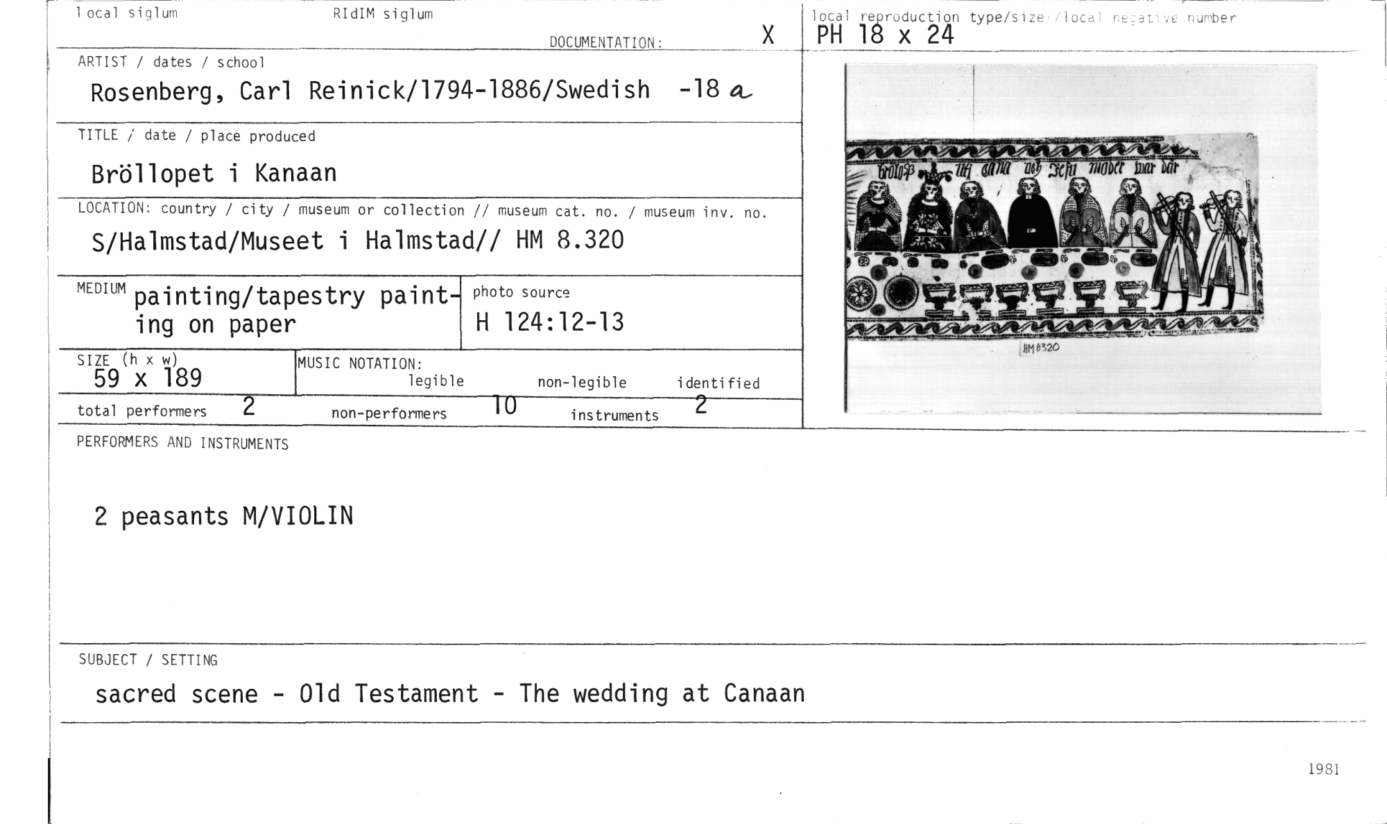 //// PERFORMERS AND INSTRUMENTS //// 2 peasants M/VIOLIN //// SUBJECT / SETTING //// sacred scene - Old Testament - The wedding at Canaan //// museum or collection // museum cat, no. / museum inv. no. //// et i Halmstad// HM 8.320 //// Bröllopet i Kanaan //// LOCATION: country / city / //// S/Halmstad/Muse //// SIZE (h x w) //// 59 x 189 //// photo source //// H 124:12-13 //// estry paint- //// MEDIUM painting/tap ing on paper //// 2 //// total performers //// non-performers //// 10 2 //// instruments //// 1 otal siglum //// RIdIM siglum //// DOCUMENTATION: //// local reproduction type/size,/local re—auv nurober //// PH 18 x 24 //// ARTIST / dates / school //// Rosenberg, Carl Reinick/1794-1886/Swedish -18 a- //// TITLE i date / place produced //// MUSIC NOTATION: //// legible non-legible identified //// 1981 ////