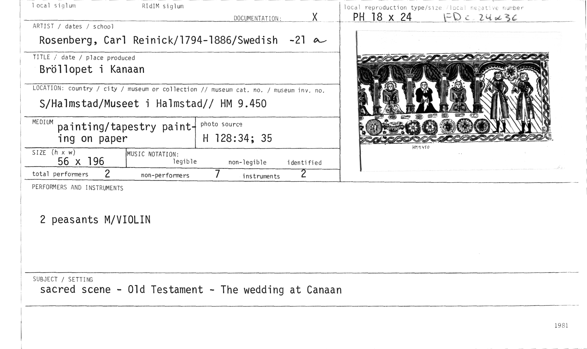 //// PERFORMERS AND INSTRUMENTS //// 2 peasants M/VIOLIN //// 2 //// instruments //// iocal siglum //// RIdIM siglum //// local reproduction type/size ilocal ne::aVve nurober //// DOCUMENTATION: //// ARTIST / dates / school //// PH 18 x 24 1/0 c 2.4,434 //// Rosenberg, Carl Reinick/1794-1886/Swedish -21 //// TITLE / date / place produced //// Bröllopet i Kanaan //// LOCATION: country / city / museum or collection // museum cat. no. / museum inv. no. //// S/Halmstad/Museet i Halmstad// HM 9.450 //// photo source //// H 128:34; 35 //// .10 //// 0 //// 1r,1.4so //// total performers //// MUSIC NOTATION: //// legible //// non-performers //// non-legible identified //// SUBJECT / SETTING //// sacred scene - Old Testament - The wedding at Canaan //// 1981 ////