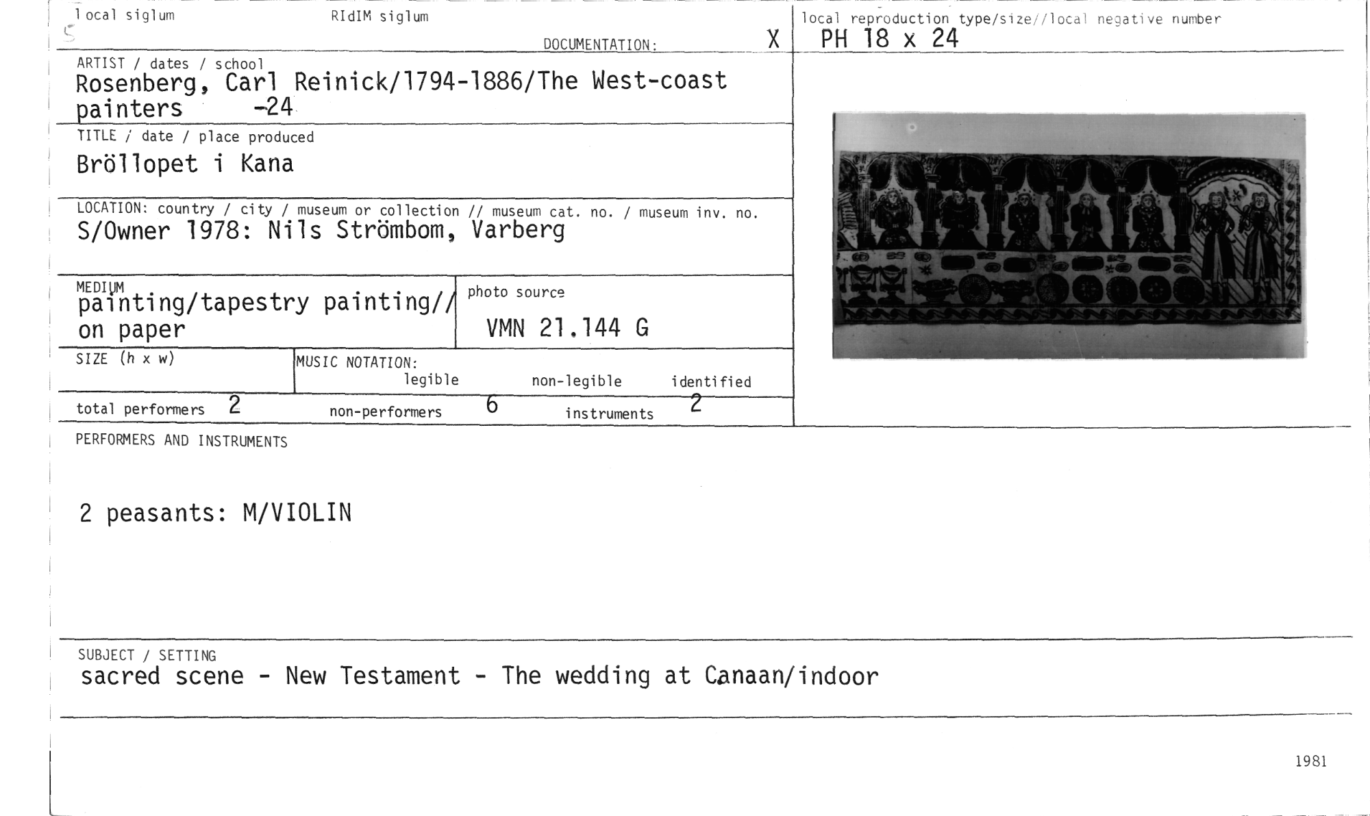 //// PERFORMERS AND INSTRUMENTS //// 2 peasants: M/VIOLIN //// SUBJECT / SETTING //// sacred scene - New Testament - The wedding at Canaan/indoor //// iocal siglum //// RIdIM siglum //// DOCUMENTATION: //// local reproduction type/size//local negative nurober //// PH 18 x 24 //// ARTIST / dates / school //// Rosenberg, Carl Reinick/1794-1886/The West-coast //// painters —24 //// TITLE / date / place produced //// Bröllopet i Kana //// LOCATION: country / city / museum or collection // museum cat. no. / museum inv. no. //// S/Owner 1978: Nils Strömbom, Varberg //// mmum //// painting/tapestry painting// //// on paper //// photo source //// VMN 21.144 G //// SIZE (h x w) //// MUSIC NOTATION: //// legible //// non-legible identified //// total performers 2 //// non-performers instruments ////