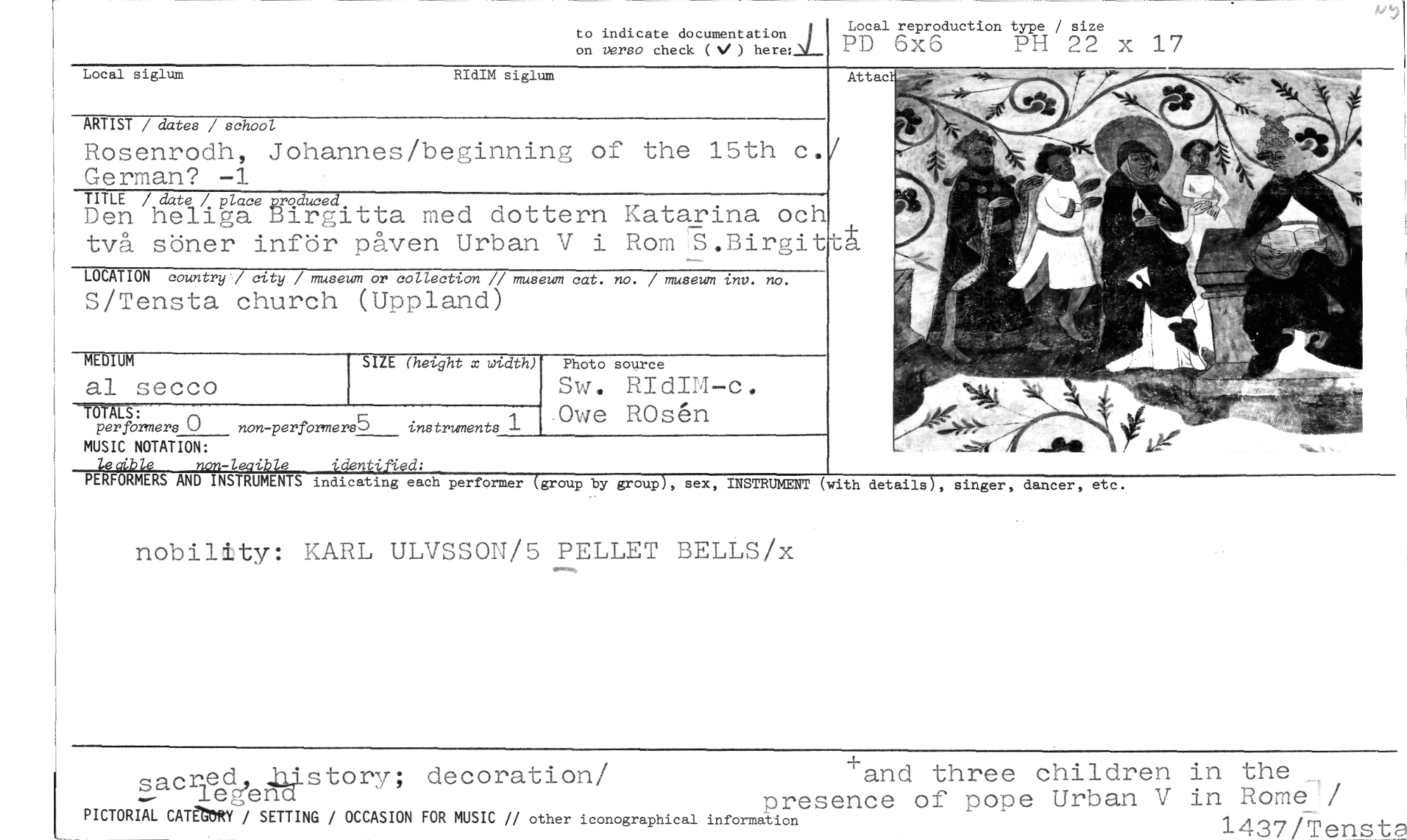 //// to indicate documentation on verso check (V ) here: //// Local reproduction type / size //// PD 6x6 PH 22 x 17 //// Local siglum RIdIM siglum //// ARTIST / dates / school //// Rosenrodh, Johannes/beginning of the 15th c./ German? -1 //// TITLE / date / placeppqduced Ml //// Den heliga Birgitta med dottern Katarina och två söner inför påven Urban V i Rom S.BirgittÅ //// LOCATION country',/ city / museum or collection // museum cat. no. / museum inv. no. //// S/Tensta church (Uppland) //// Attac //// MEDIUM SIZE (hetght x width) //// al secco //// //// Photo source //// Sw. RIdIM-c. Owe ROsen //// -71n77-- //// per formers u non-perfoiners5 instruments 1 //// MUSIC NOTATION: //// non-lecible identified: //// PERFORMERS AND INSTRUMENTS indicating each performer (group by group], sex, //// INSTRUMENT (with details), singer, dancer, etc. //// nobility: KARL ULVSSON/5 PELLET BELLS/x //// OM, //// sacred story; decoration/ tand three children in the //// leeen presence of pope Urban V in Home/ //// PICTORIAL CATNRY / SETTING / OCCASION FOR MUSIC // other iconographical information— //// 1437/TenSta ////